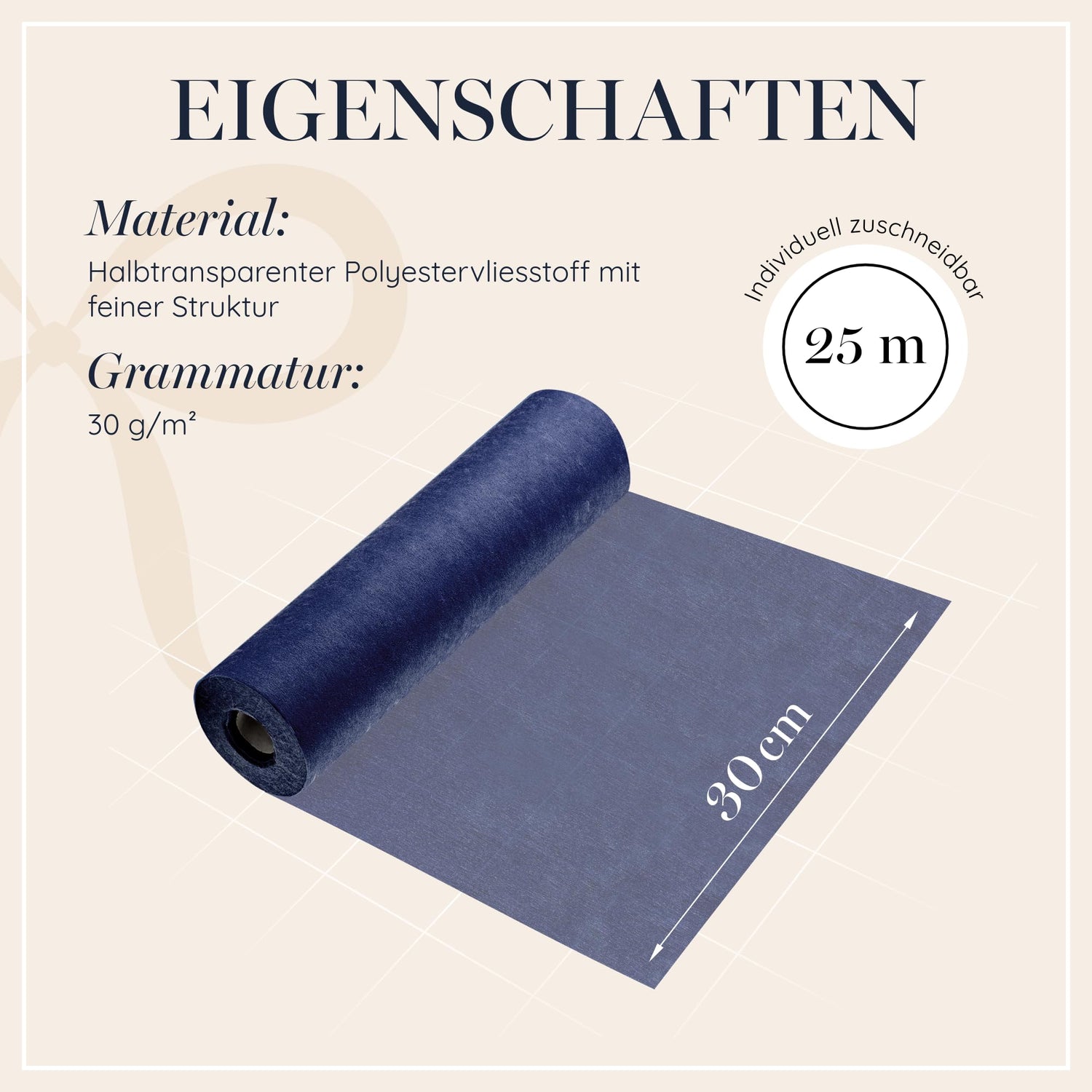 • Lieferumfang: 1 x Vlies Tischläufer Rolle (30 cm x 25 m), aus Polyester-Stoff mit leichter Transparenz in Nachtblau (Dunkelblau) von 100%Mosel