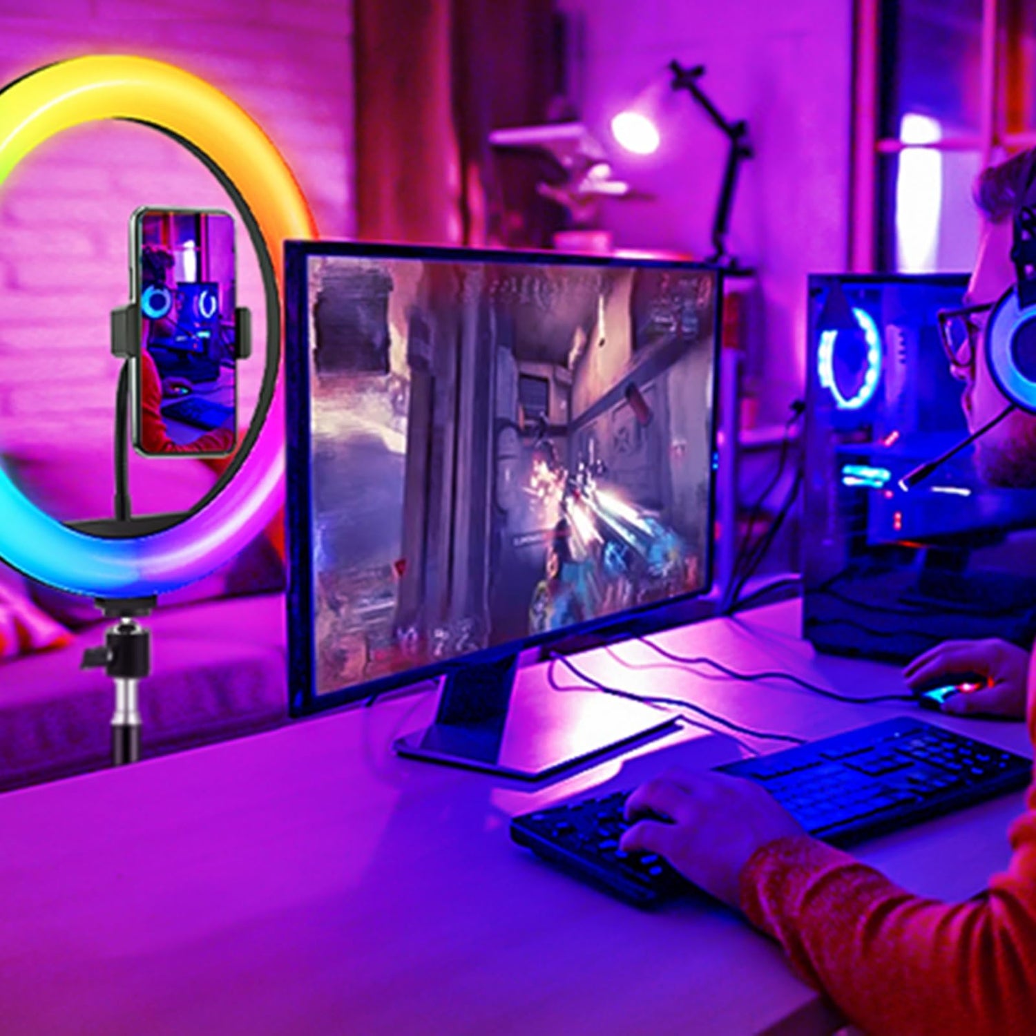 11.5 Zoll Ringlicht mit Stativ Handy, Tisch LED Ring Light Kamera Handystativhalter mit Ringleuchte für YouTube, Selfie, Makeup, Fotografie, 40 RGB-Modi 13 Helligkeit
