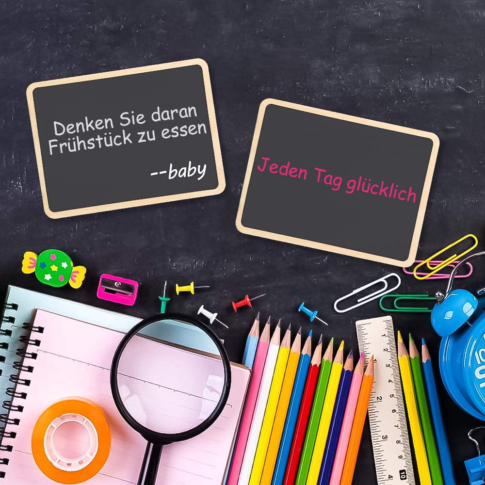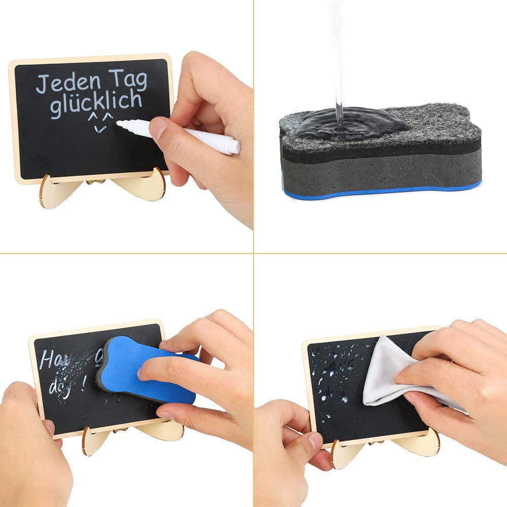 • 【Einfach zu benutzen】Eine Kombination aus Holzschilder zum Beschriften, Ständer, Radiergummi und Lappen. Mit einem kompletten Satz können Sie den Spaß an der Verwendung der Tafel genießen.
