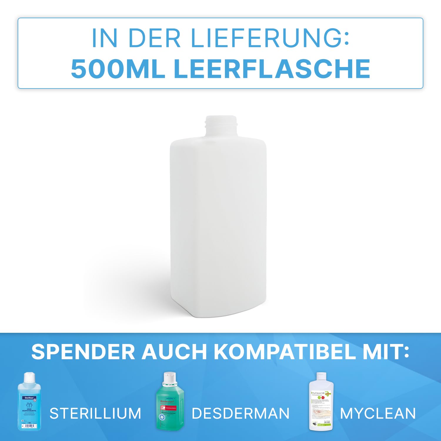 • PASSEND ZU EURO-FLASCHEN ✓ Der Desinfektionsmittelspender passt zu herkömmlichen Euro-Flaschen sämtlicher Hersteller. Sie können aber auch die passend mitgelieferte Leerflasche beliebig oft mit Händedesinfektion, Seife oder Duschgel nachfüllen.
