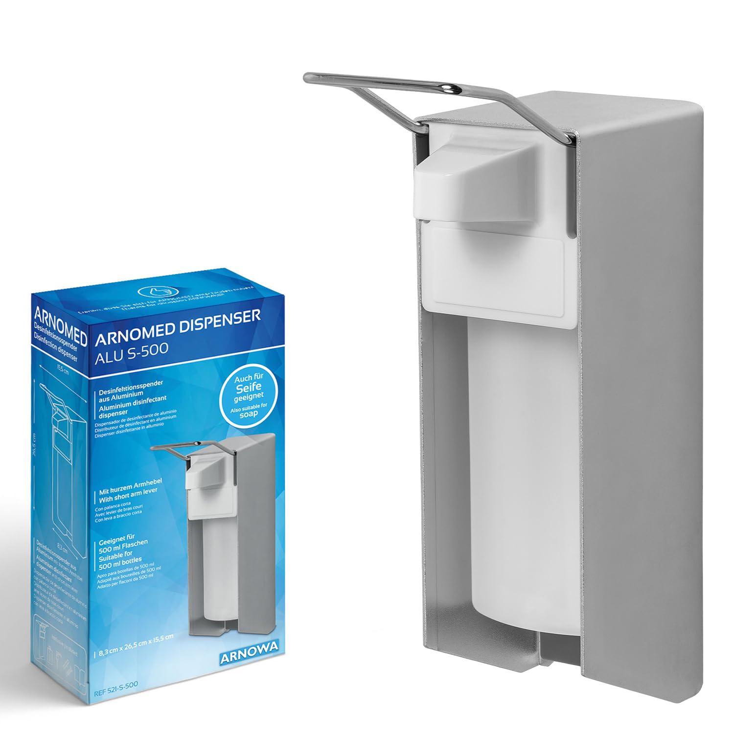 1x ARNOMED Desinfektionsspender Aluminium, Seifenspender für 500ml, kurzer Armhebel, Seifenspender zur Wandbefestigung, Eurospender für Desinfektionsmittel, Soap Dispenser, Desinfektionsmittelspender