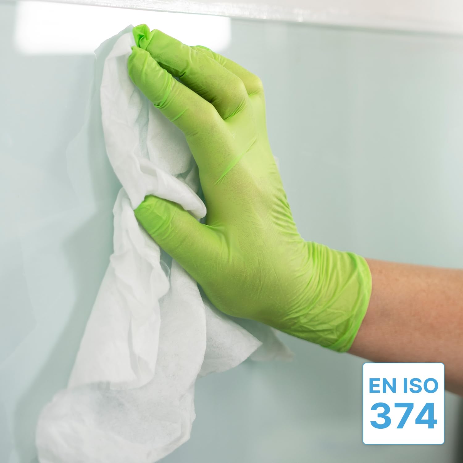 • ZUVERLÄSSIGER SCHUTZ ✓ Diese limettengrüne Nitrilhandschuhe erfüllen höchste Standards (EN 455 & EN 374) und bieten Schutz vor Viren, Chemikalien & Co. - ob für Hygiene- & Reinigungsarbeiten zuhause oder im professionell medizinischen Bereich!