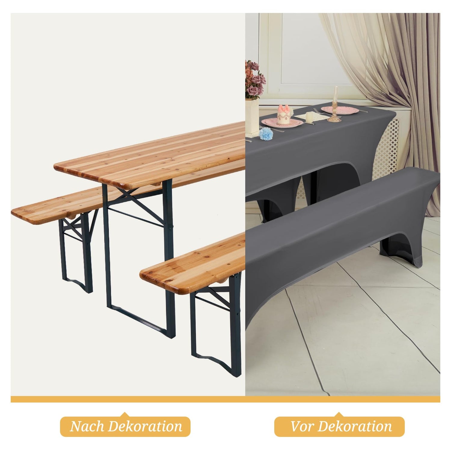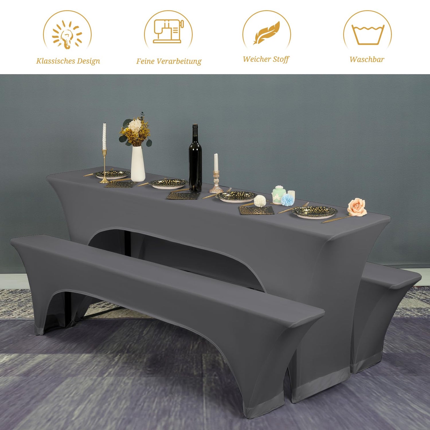 • Premium-Material: Die Wasserdicht Bierzeltgarnitur aus hochwertigem Vier-Wege-Stretch-Elasthan-Material, ca. 1000 Gramm pro 3er-Set, 90 % Polyester und 10 % Elasthan, weich und knitterarm, Wasserdicht,strapazierfähig. Durch die pflegeleichte Qualität.