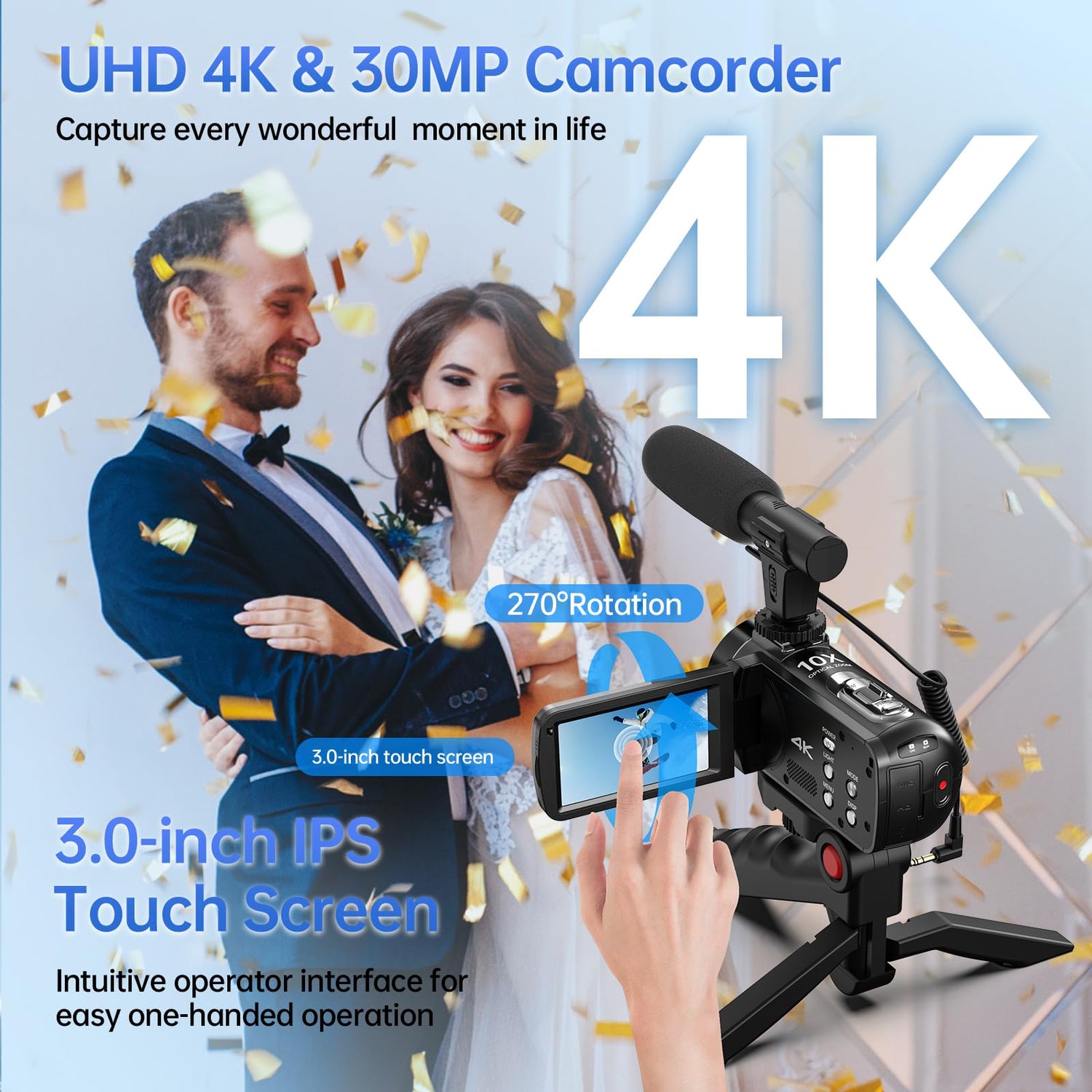 4K Videokamera Camcorder, 10X Optischer 120X Intelligenter Zoom Vlogging Kamera, 30 MP Autofokus Webcam Camera mit Stativ, 3,0-Zoll-IPS-Touchscreen, Mikrofon, 32 GB SD Karte, 2 Batterien für YouTube