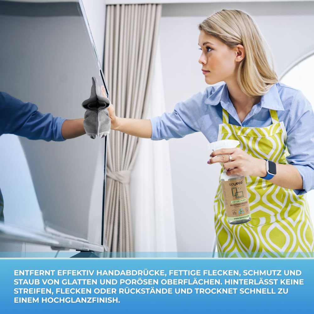 • ÖKOLOGISCH - Es ist umweltfreundlich und enthält keine schädlichen Chemikalien wie Ammoniak, Phosphate oder Alkohol. Die ökologische Formel der Flüssigkeit, die auf pflanzlichen Inhaltsstoffen basiert, sorgt für eine perfekt saubere Bildschirmoberfläche und verleiht einen angenehmen, natürlichen Duft.