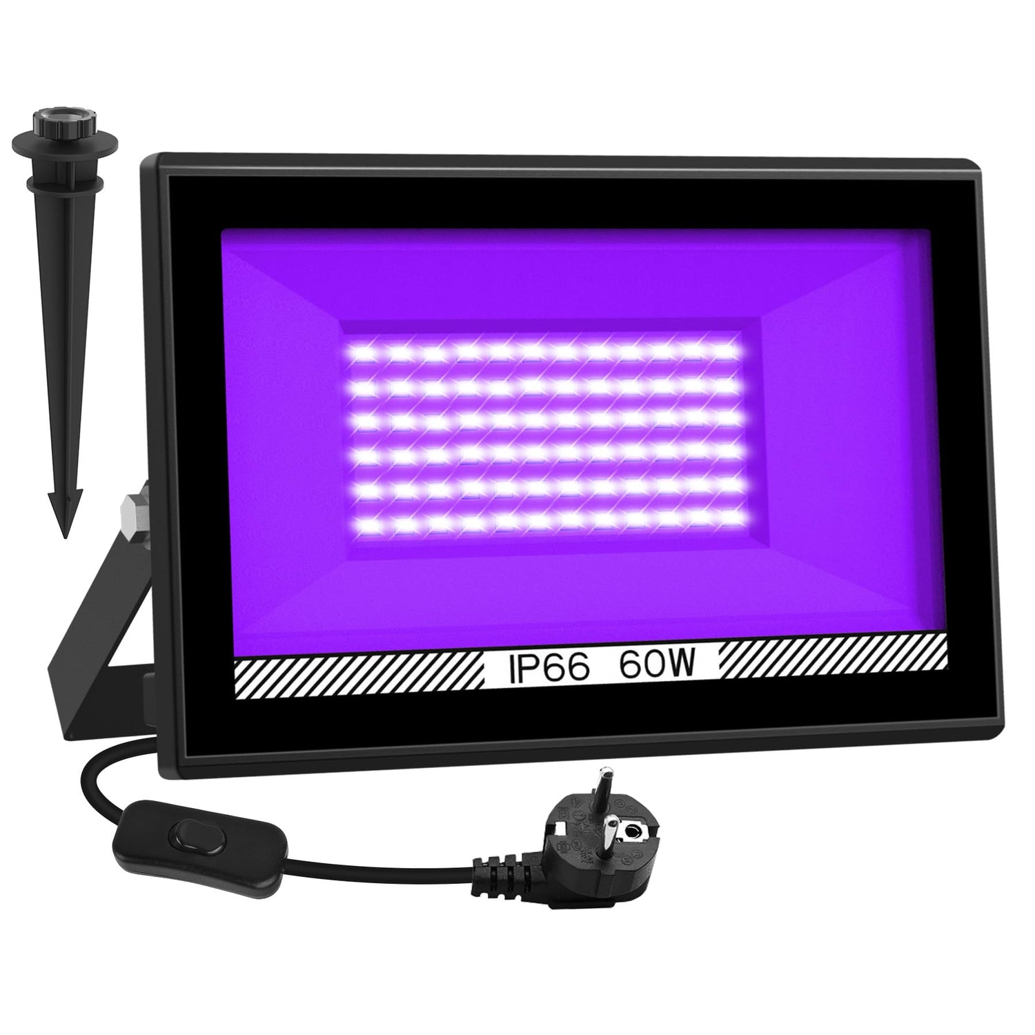 Einzelheiten: 60 W UV-LED-Schwarzlicht NATPOW 60 W UV-LED-Flutlicht, ausgestattet mit 72 hochwertigen SMD-LED-Perlen, bietet einen Abstrahlwinkel von 120° und kann für ausreichende Beleuchtung für Weihnachten, Halloween, Partys, Aquarien usw. sorgen. Verbesserte Wärmeableitung Gehäusedesign aus Aluminiumdruckguss, effiziente Kühlstruktur und Hochtemperaturglas machen diese LED-Sicherheitsbeleuchtung für den Außenbereich langlebiger und zuverlässiger. Es kann diesen LED-Strahler vor extremen Wetterbedingungen schützen. IP66 wasserdichtes Flutlicht Mit IP66 wasserdicht und rostfrei und oberflächenbehandelt mit hochwertiger elektrostatischer Adsorption stellt es sicher, dass das Licht bei Regen, Schnee, Hitze oder Kälte ordnungsgemäß funktioniert und bietet ein stabiles und helles Licht für Gärten, Innenhöfe, Villen, Parks, Garagen, Schwimmbäder, Dächer, Gebäude, Straßen, Wege usw. Einfache Installation und 180° einstellbarer Winkel Ausgestattet mit UK-Stecker, einfach einstecken und los geht‘s. Sie können es mit Schrauben am Boden, an der Wand oder an der Decke oder mit einem Erdspieß in Ihrem Garten installieren Sicherheits-UV-Licht Mit einer Wellenlänge von 400 nm bis 405 nm eignet sich unser UV-Flutlicht sehr gut zum Beleuchten sichtbarer fluoreszierender Materialien wie schwarzlichtreaktiver Pigmente, Farben und Farbstoffe. Bitte beachten Sie, dass dieses Schwarzlicht der UV-A-Stufe sicher für Ihre Augen und Haut ist, aber starren Sie bitte nicht für längere Zeit in diese Lampe.
