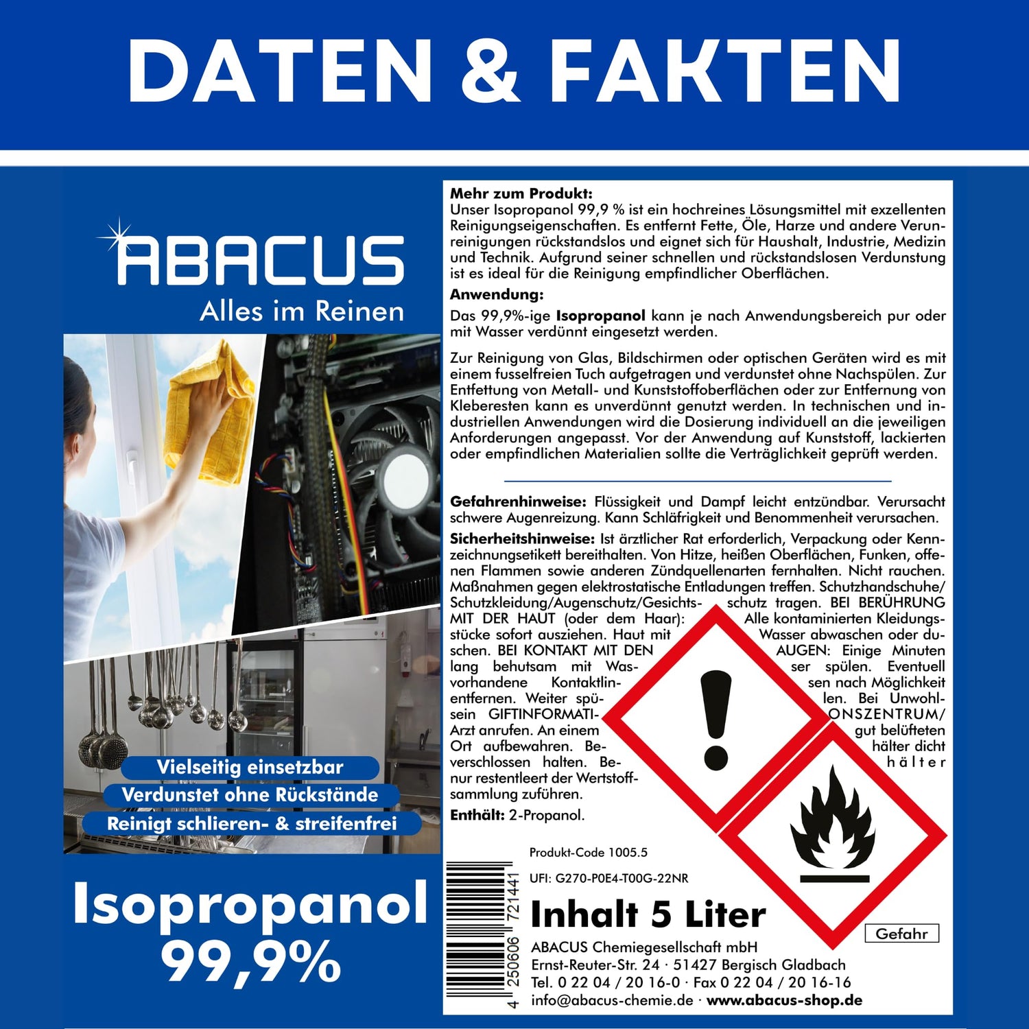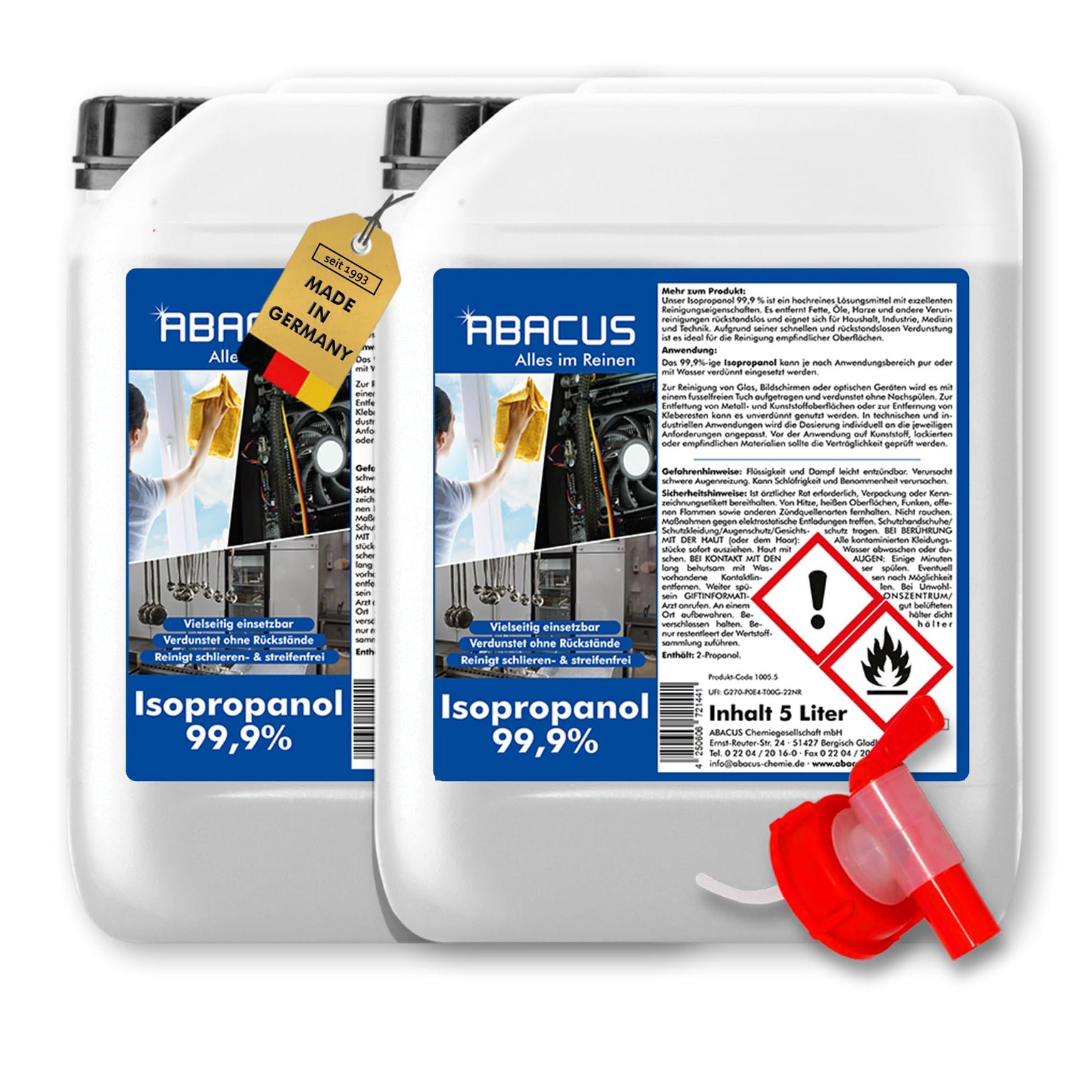 ABACUS® Isopropanol 99,9% | 2x 5L | Isopropylalkohol 99,9% | Reinigungsalkohol für Haushalt, Industrie, Elektronik & Kosmetik | Entfettet & reinigt rückstandslos | nicht leitend
