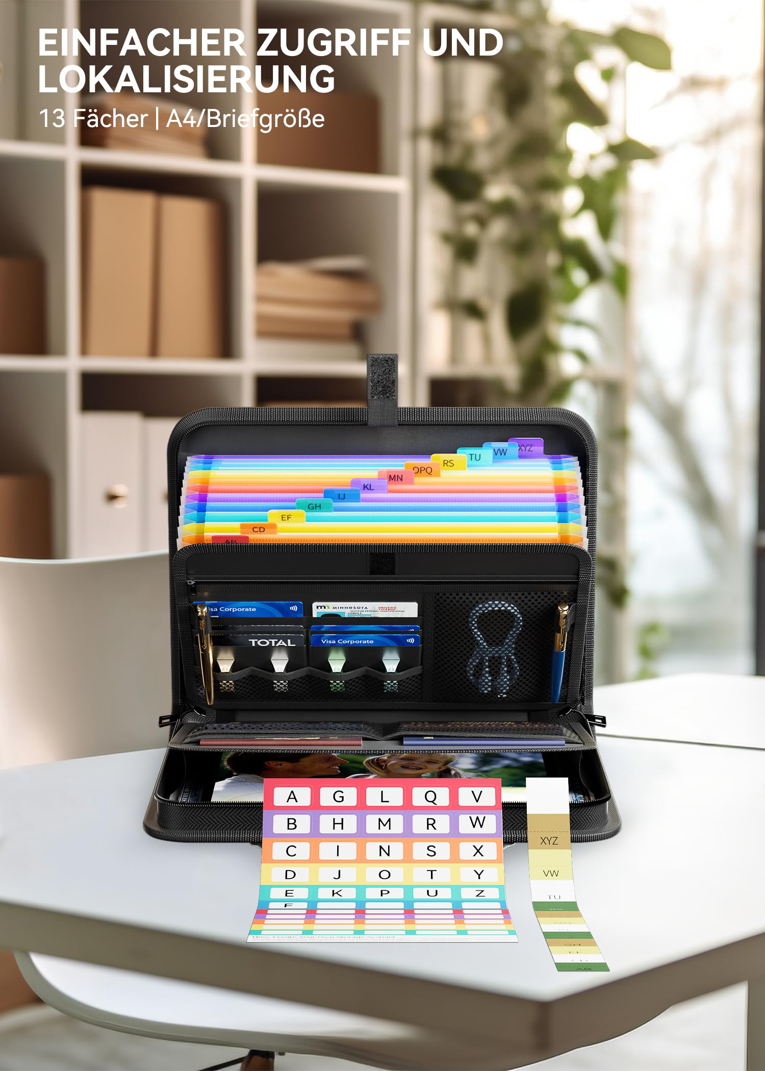 • 【EINFACHER ZUGRIFF UND LOKALISIERUNG】Einzigartige Einsteck- und Klebeetiketten sowie 13 farbige Trennwände helfen Ihnen, Ihre Dateien effektiv zu klassifizieren. Greifen Sie einfach und schnell auf Ihre wichtigen A4/Briefgrößen-Dokumente mit unserem Aktenordner-Organizer zu.