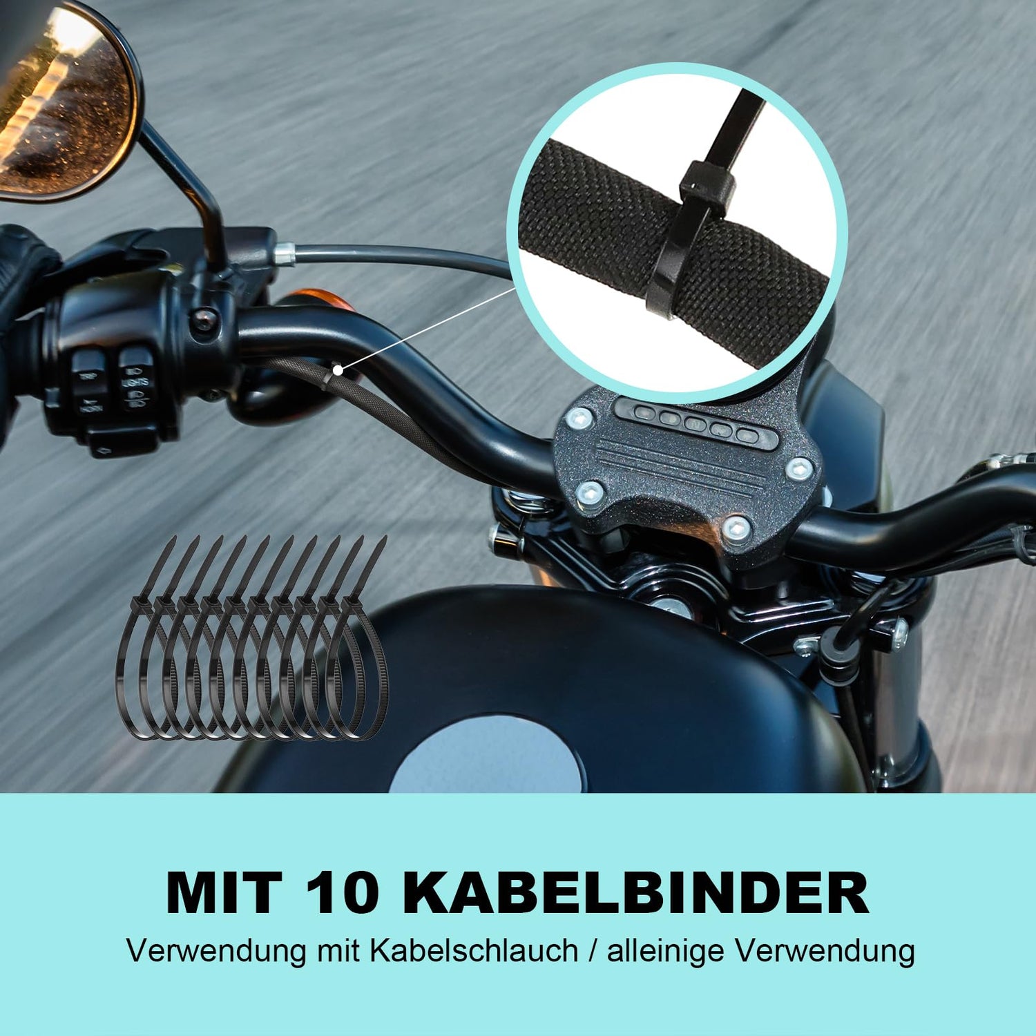 • 【10 Kabelbinder enthalten】Unsere Kabelmäntel werden mit 10 Kabelbindern geliefert, um das Kabel zu fixieren und für Ordnung zu sorgen. Mit Hilfe von Kabelbindern kann der Kabelschlauch perfekt die Kabel von Motorrädern, Fahrrädern und Automotoren fixieren.