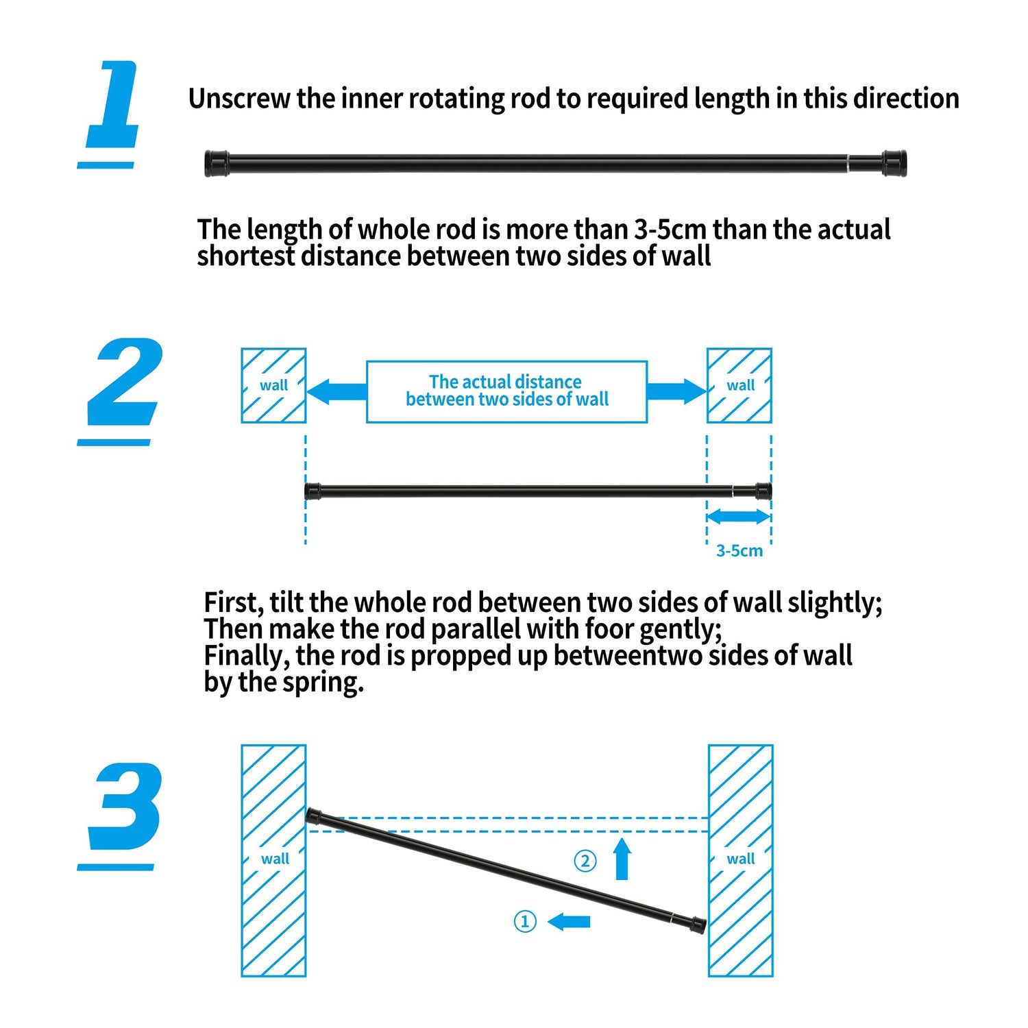 • 【Paketinhalt & Achtung】 1PC 40-63CM Teleskopstange und 1PC 25CM Verlängerungsstange. Vorhangstange ohne Bohren, bitte stellen Sie sicher, nach dem zweiten Bild und dem Installationsvideo auf der linken Fotogalerie zu installieren.