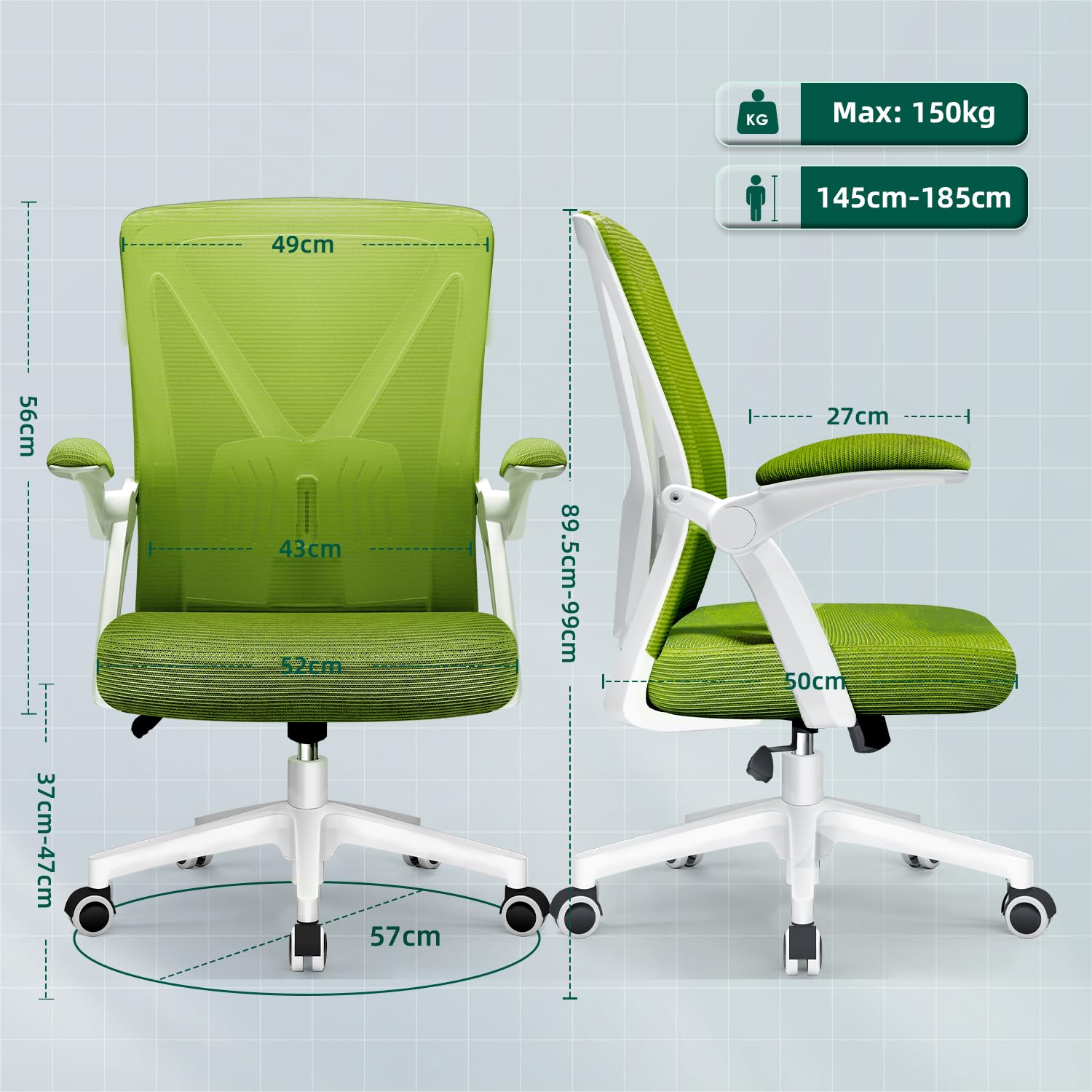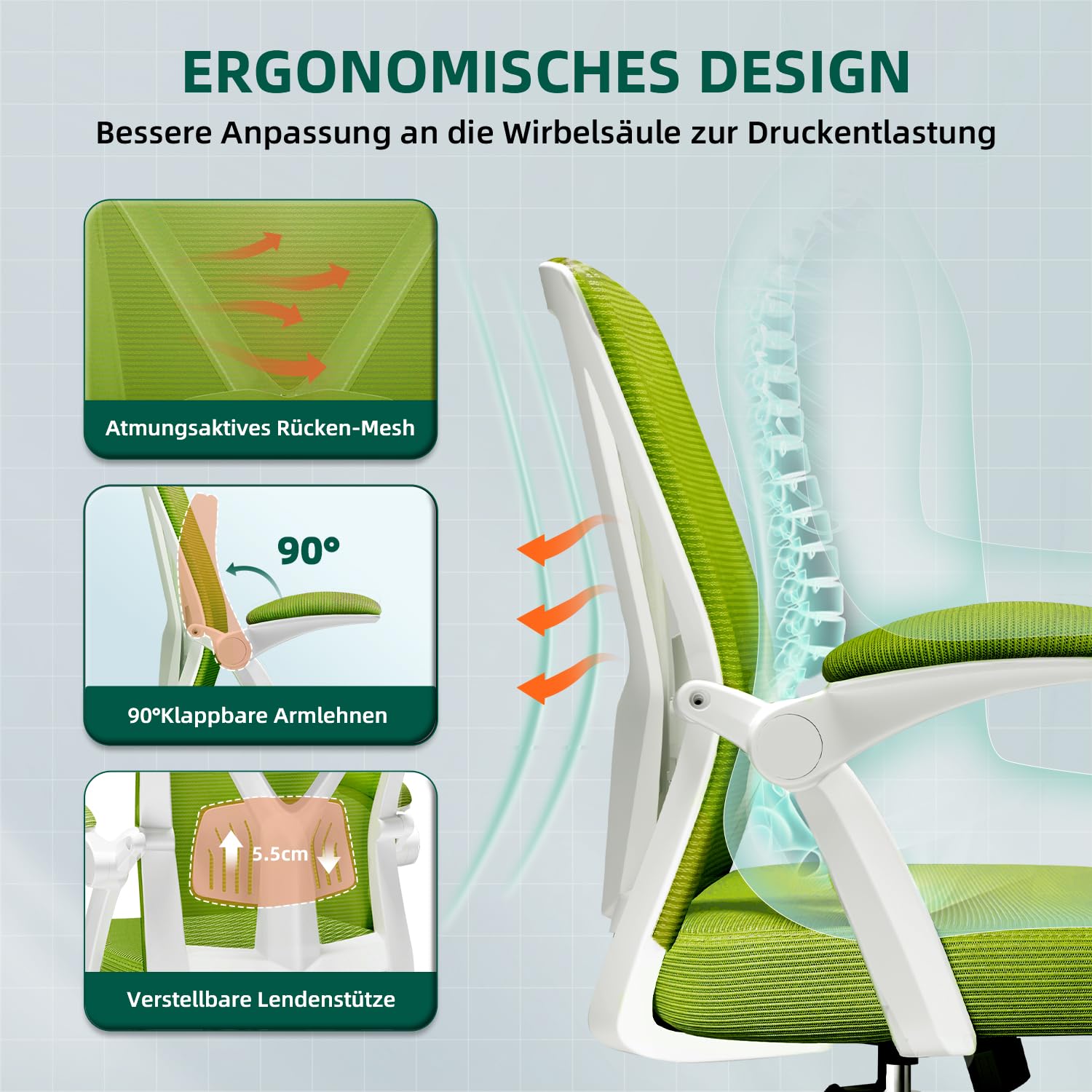 Airchros Bürostuhl, Schreibtischstuhl mit Einstellbarer Lendenstütze, Hochklappbaren Armlehnen, Höhenverstellbarer Ergonomischer Bürostuhl, Netzstuhl mit Wippfunktion bis 125°,Grün