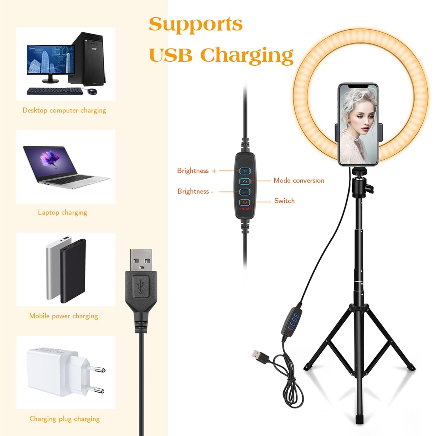 • 【USB-Stromversorgung】 Die USB-Anschlüsse können mit mehreren Geräten verwendet werden, z. B. zum Anschließen eines USB-Ladegeräts, einer mobilen Stromversorgung, eines Computerhosts und eines Laptops. Sie können LED-Ringlicht jederzeit frei genießen!