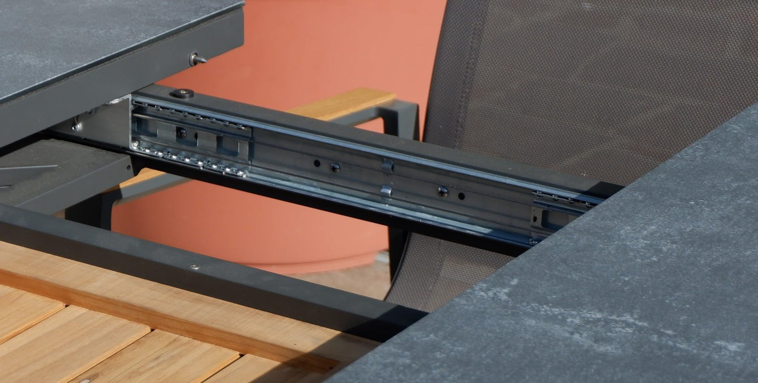 • Abmessungen Tisch: 180x90cm ausziehbar auf 240x90cm, Höhe: 75-77cm, 42kg