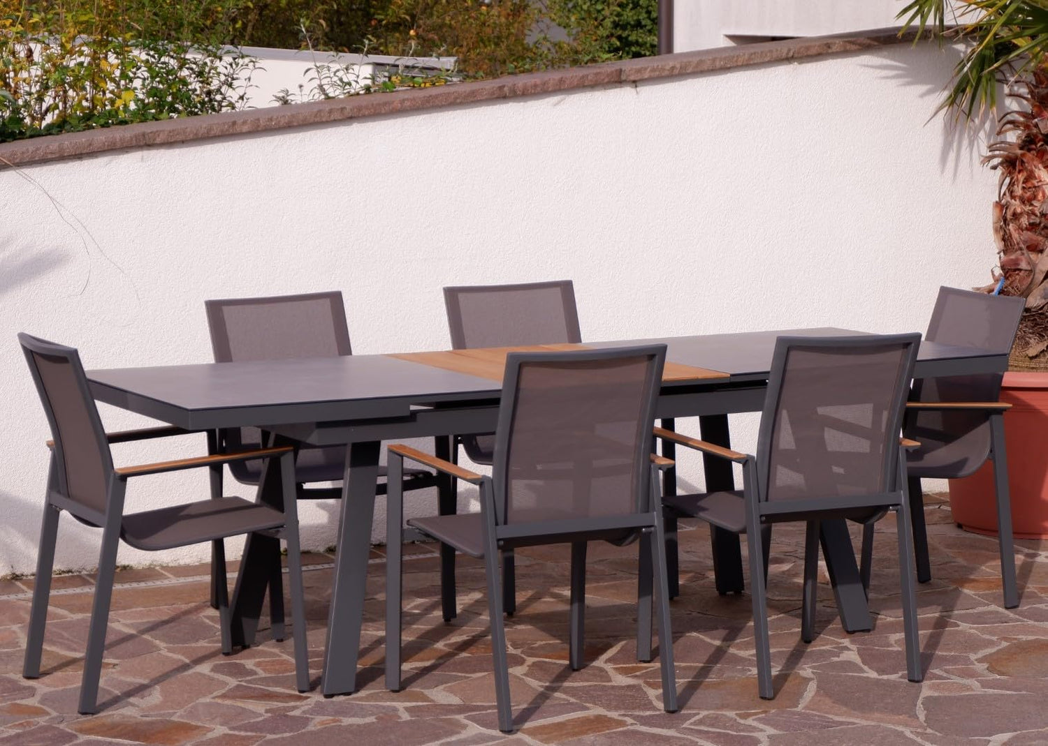 ALEOS. Gartengarnitur Gartenset Aluminium Teak Set mit quadratischem Ausziehtisch 180x90cm auf 240cm ausziehbar + 6 Stapelstühle anthrazit Trinidad