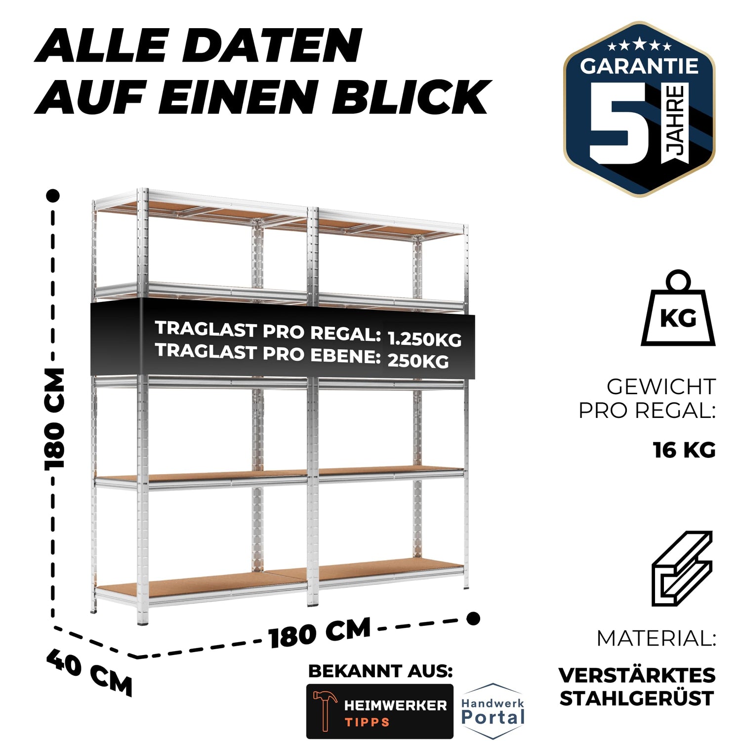 • ✅ [ABMESSUNG] 2x 180 x 90 x 40 cm (HxBxT) | Traglast: 1250 kg | 5 höhenverstellbare MDF-Böden | Stecksystem (werkzeugfreie Montage) | verzinkter Stahl