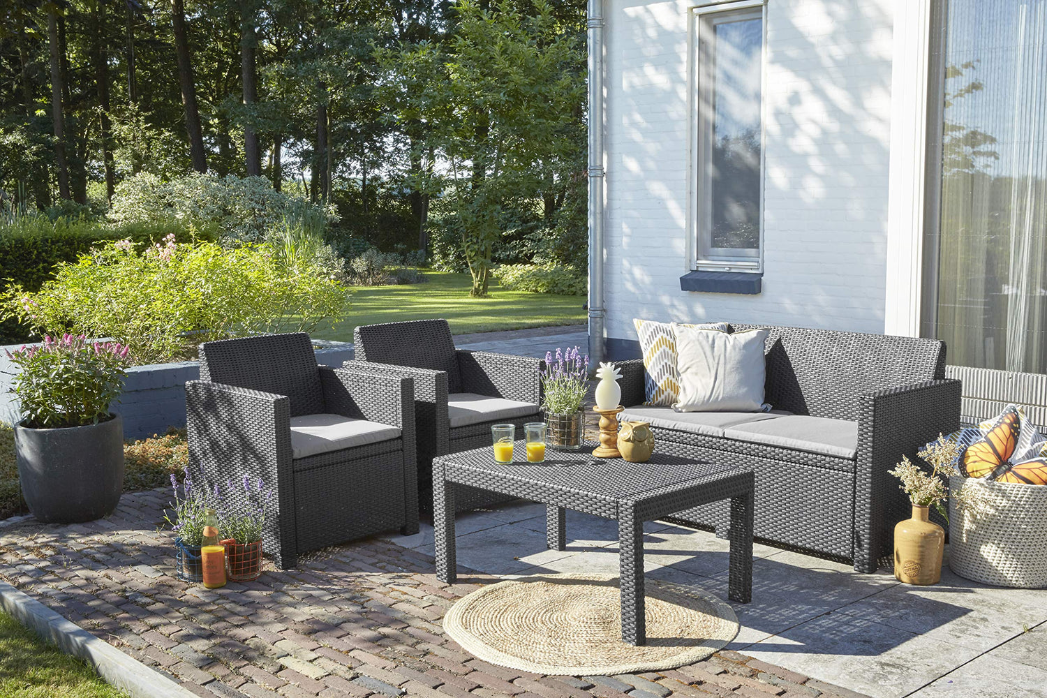 Allibert by Keter Merano Gartenmöbel Set aus Kunststoff, inkl. Sitzkissen, grau, 4-teilig, 2 Sessel, Sofa & Tisch, für Garten & Terrasse, Flache Rattanoptik