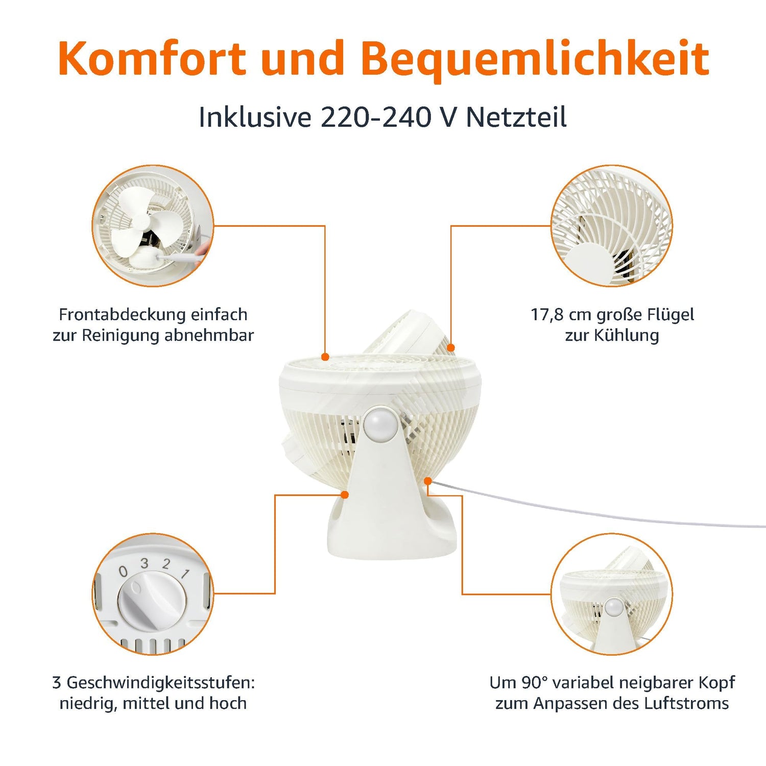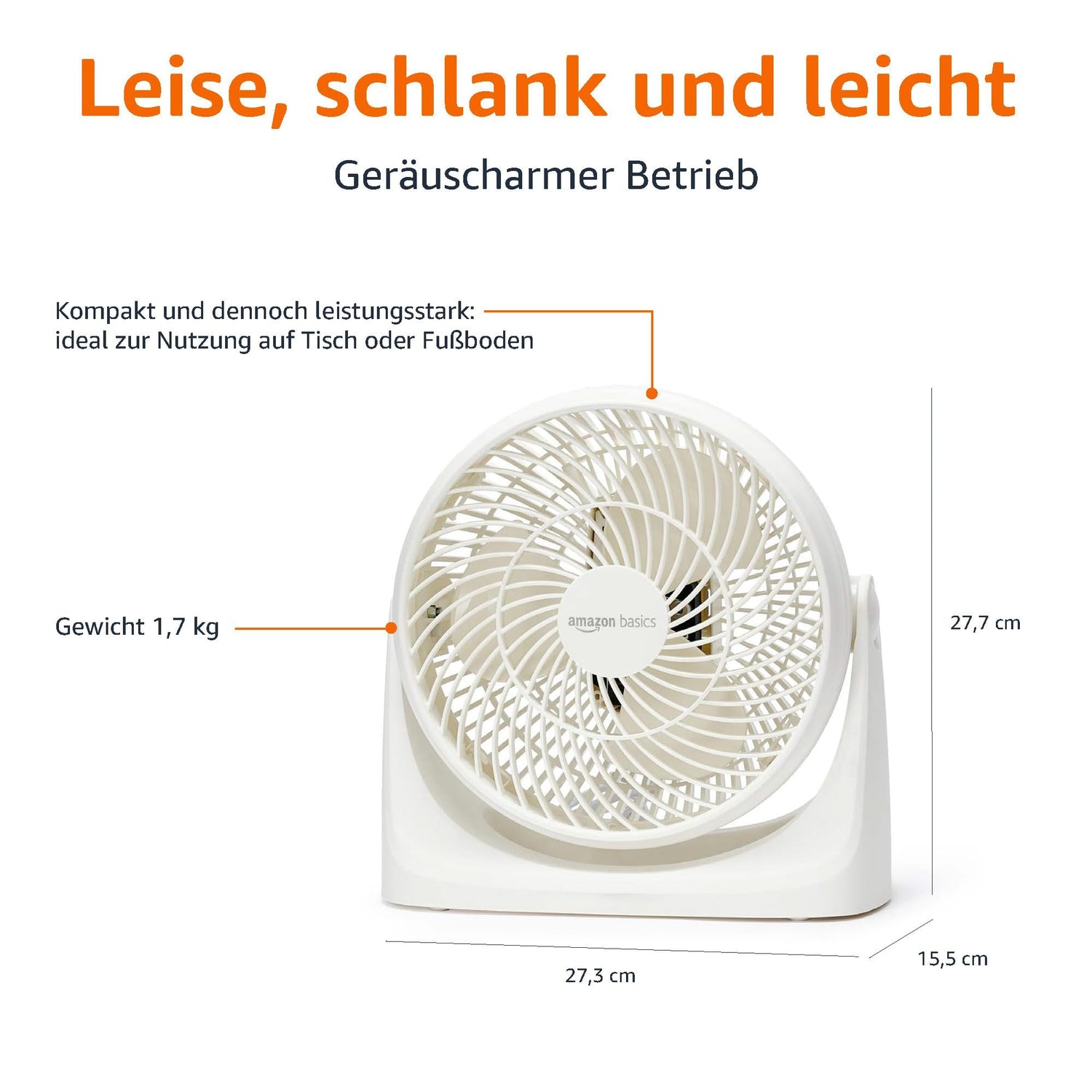 • Leicht und tragbar: Der 18 cm große Ventilator ist ideal für kleine Flächen, wie Schreibtische, Nachttische und Arbeitsflächen und Schlafzimmer, Wohnzimmer oder Küchen.