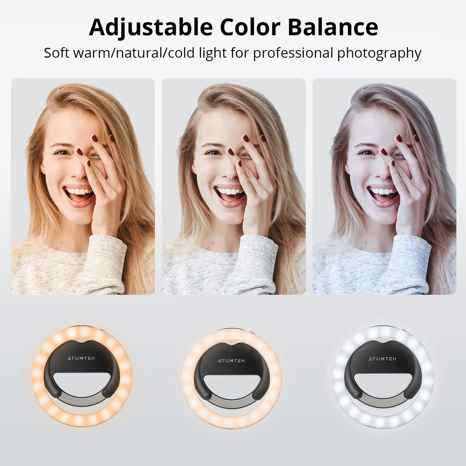 • ✨【Lichter zeigen jederzeit Ihre Schönheit】 ATUMTEK 4 '' LED-Ringlicht verfügt über 40 LED-Chips im Inneren des Lichts, die 3 verschiedene Lichtfarben bieten können (kaltweiß/ Warmweiß/ Nature). Der Farbtemperaturbereich reicht von 2800K-6500K und bietet Ihnen die besten Hauttöne im Video. Dieses Ringlicht kann auch auf 5 verschiedene Helligkeitsstufen eingestellt werden, kein Schatten, keine Blendung.