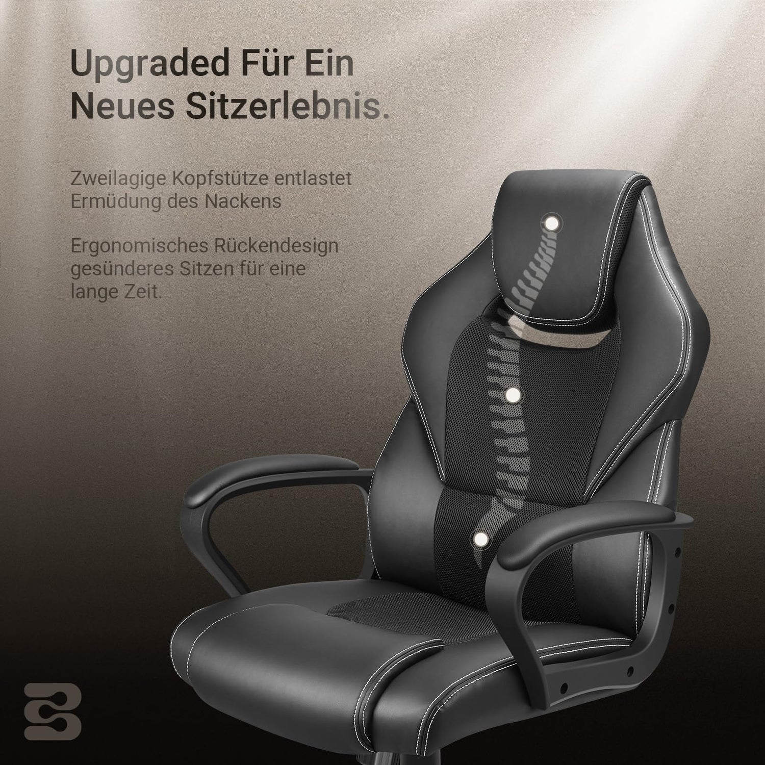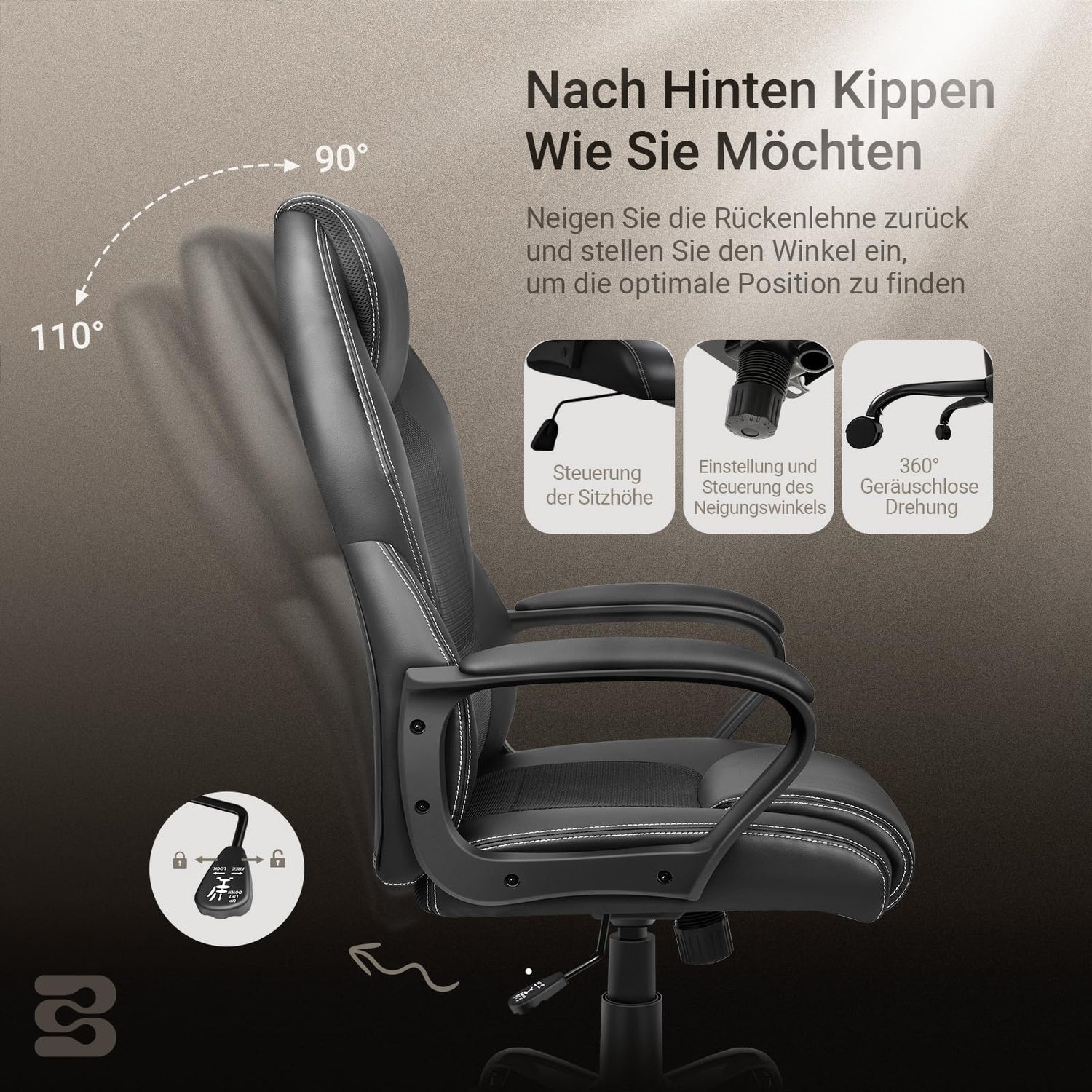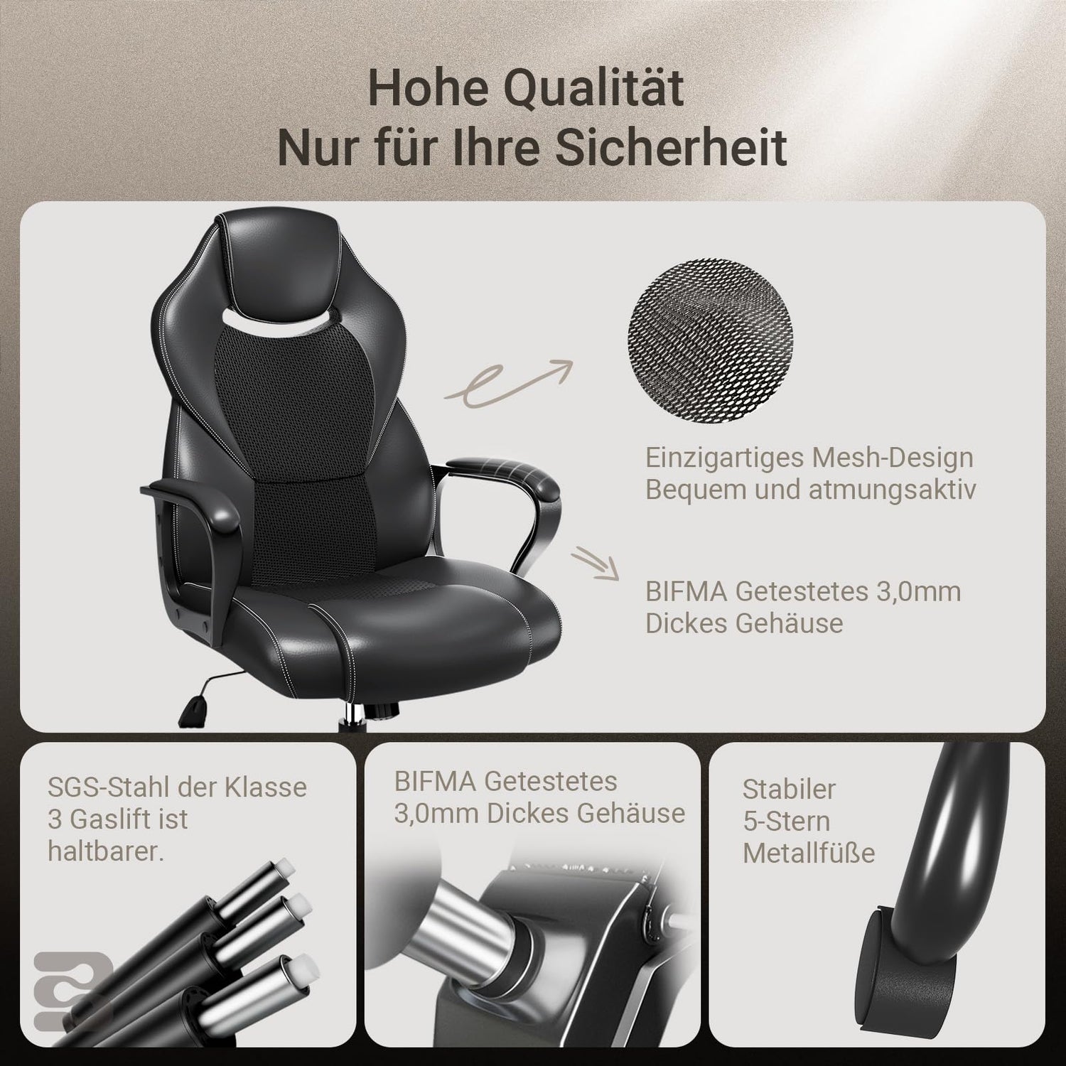 • 🔥Bequem und atmungsaktiv - Unser Bürostühle besteht aus hochdichtem Schwamm und hochwertigem PU-Leder, das mit strapazierfähigem, atmungsaktivem Netzgewebe bezogen ist. Hohe Luftdurchlässigkeit, egal ob im Winter oder im Sommer, bietet Ihnen ein angenehmes Sitzgefühl. Darüber hinaus bieten Ihnen die verdickte Nackenstütze und die gepolsterten Armlehnen einen hervorragenden Komfort für lange Arbeits- oder Unterhaltungsstunden