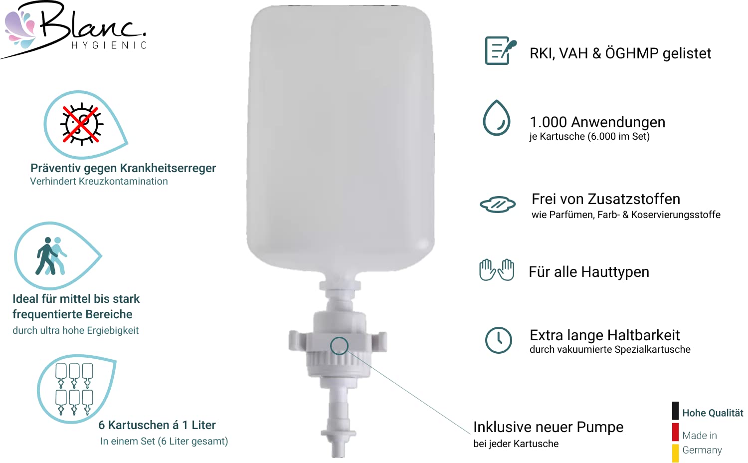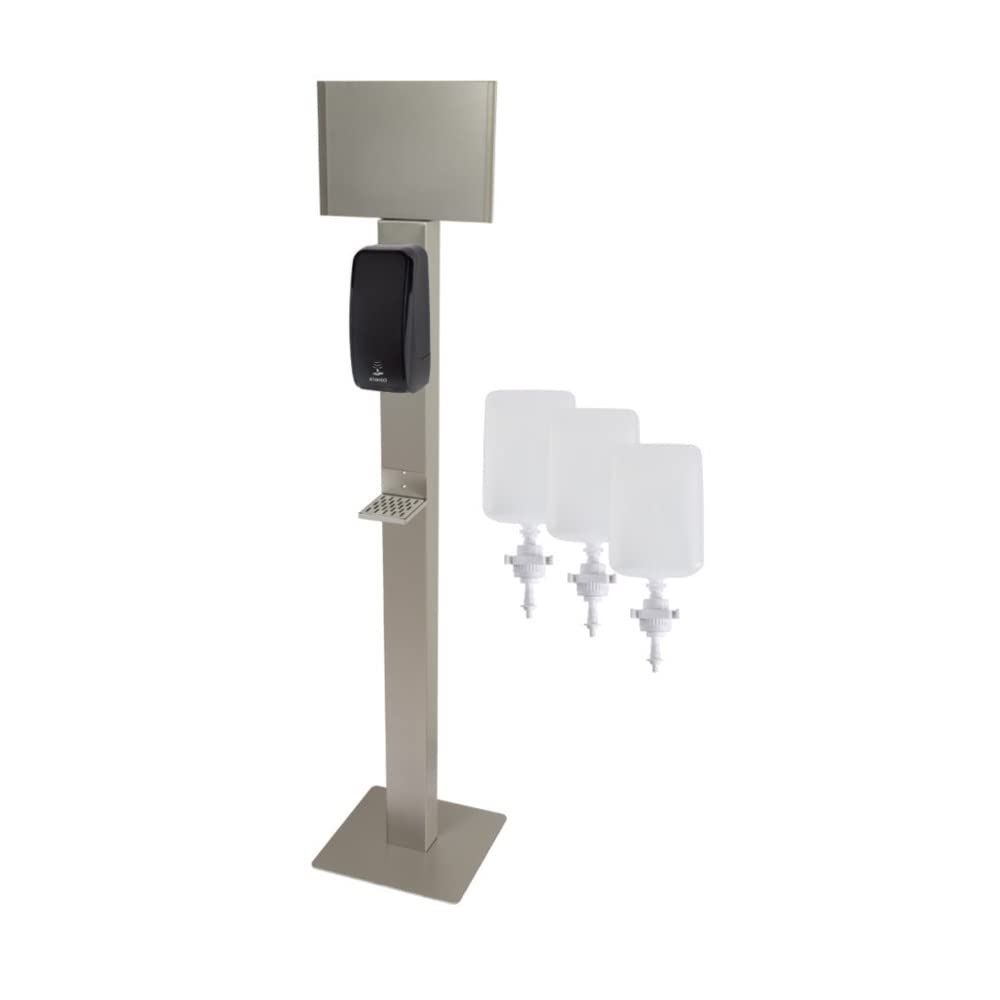 • Komplettpaket: Dieses exklusive Set enthält 1x Hygienespender mit Standfuß zum Aufstellen, 3x 1 L Kartusche Handdesinfektionsmittel. Made in Germany.