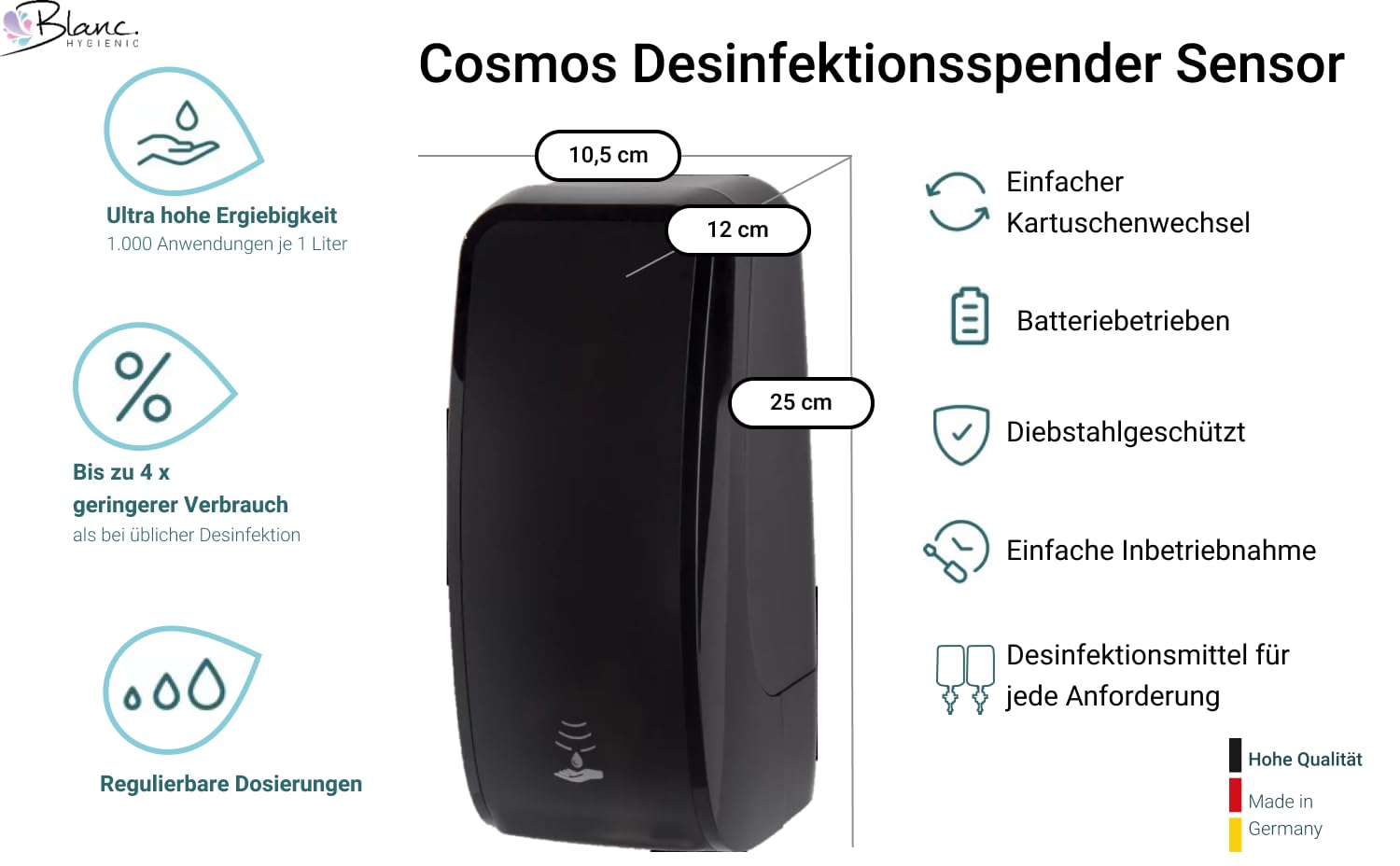 Blanc HYGIENIC Desinfektionsspender Cosmos – Spender mit Sensor und Standfuß, Spender stehend und 3X 1 Liter Desinfektionsmittel, ergiebige Händedesinfektion für ca. 3.000 Anwendungen, Schwarz