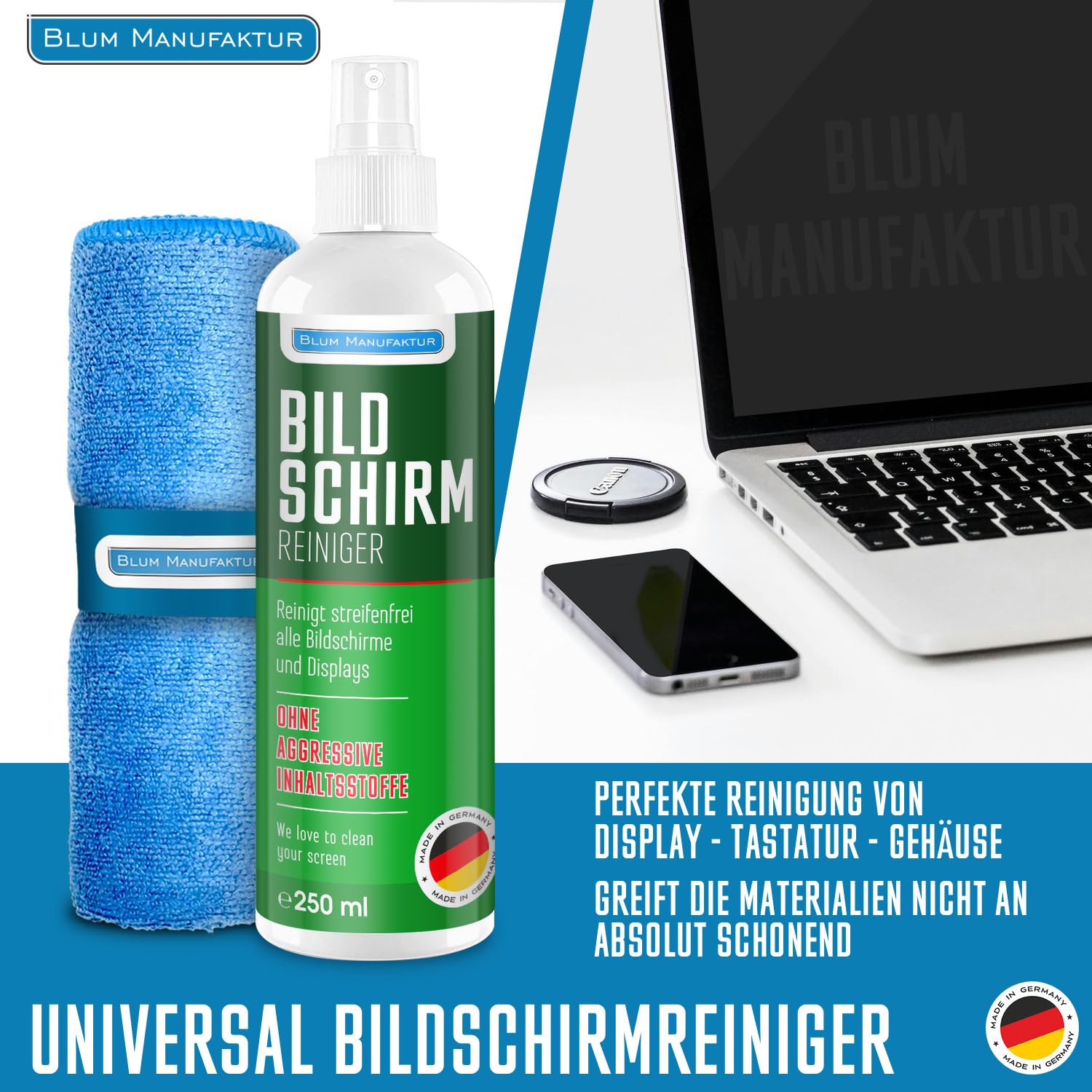 Blum Manufaktur 250ml Bildschirmreiniger + 30x30 cm Mikrofasertuch - Screen Cleaner - Display Reiniger - Absolut streifenfreie Reinigung von Handy, Laptop, PC, TV