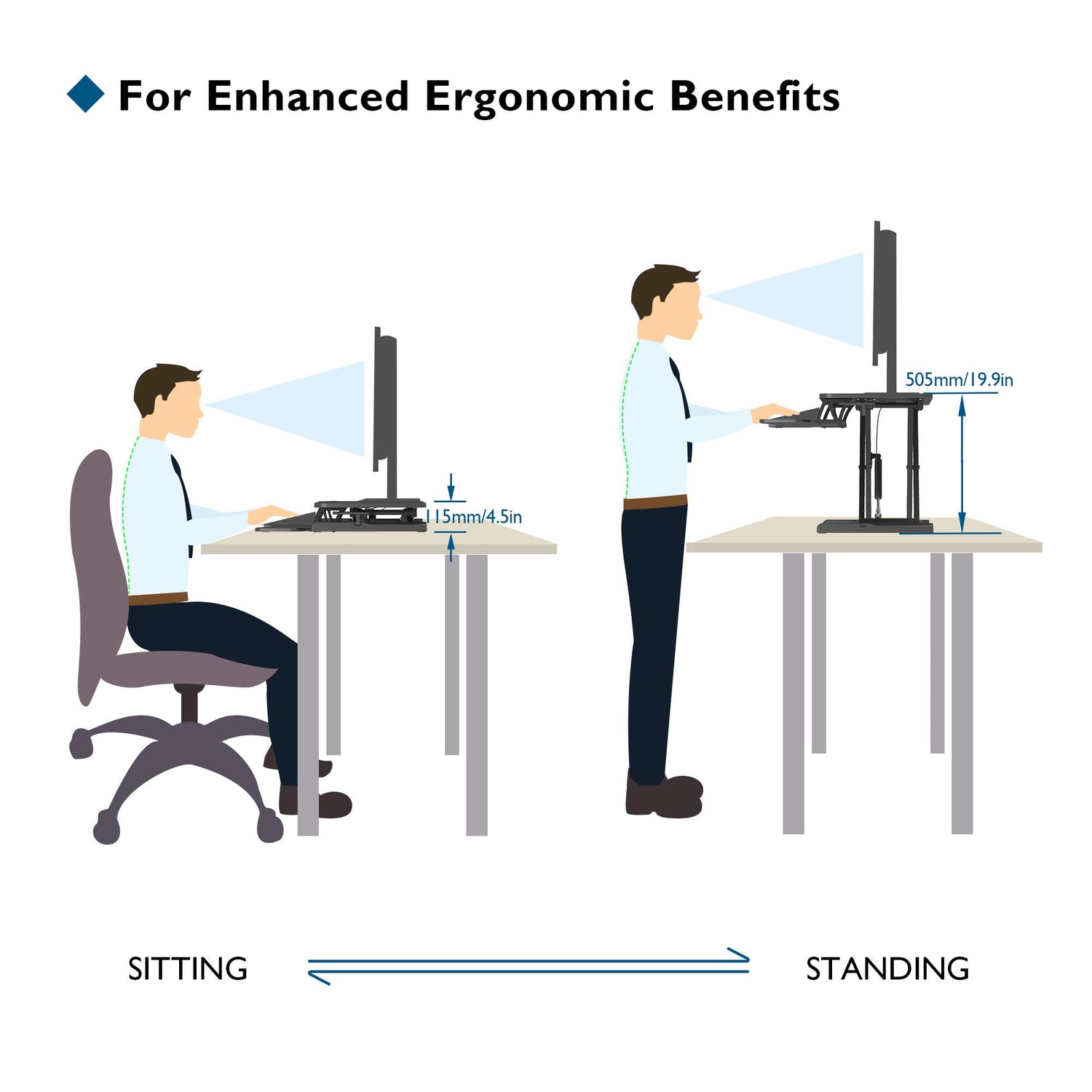 • Ergonomisches Design: Die Tastaturablage ist ergonomisch für Maus und Tastatur ausgelegt. Die Höhe kann frei zwischen 115 mm und 505 mm eingestellt werden. Mit Hilfe der Gasfeder ist der Übergang von Sitz- zu Stehpositionen schnell und einfach mit zwei Quetschriegeln, um die ideale Höhe zu wählen