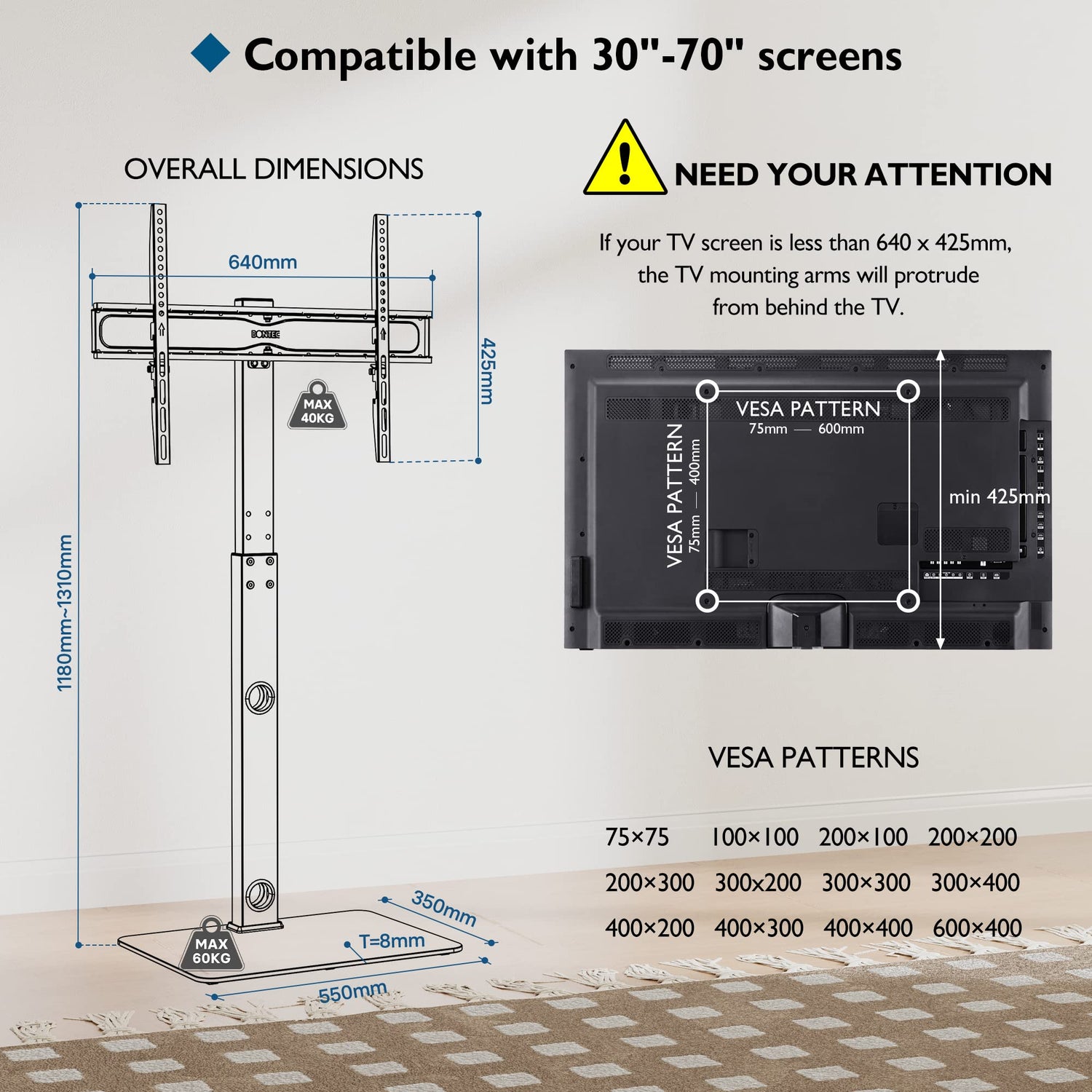 • Kompatibilität - Der TV Ständer ist für Fernsehbildschirme von 30 bis 70 Zoll mit einer maximalen Tragfähigkeit von 40 kg; Konform mit VESA-Mustern 75 x 75/100 x 100/200 x 100/200 x 200/200 x 300/300 x 300/300 x 400/400 x 200/400 x 300/400 x 400/600 x 400; TV-Marken wie Samsung LG Electronics Sony, Samsung, LG, Philips, Toshiba, Sharp, Mitsubishi, Sanyo, JVC, Logik, Digihome und Technika LCD-LED-OLED-QLED-Plasmafernseher