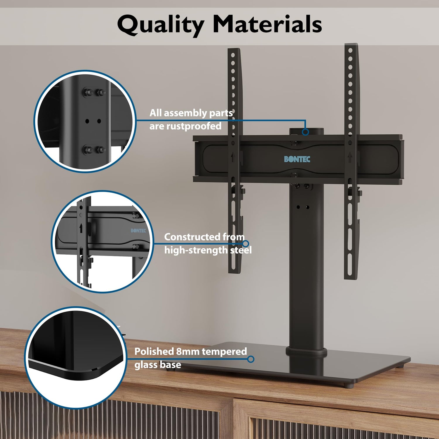 • STABILITÄT - Hochwertiger kaltgewalzter Stahl ist das Hauptmaterial und bietet mit einer maximalen Tragfähigkeit von 45 kg einen stabilen und langlebigen TV Standfüße. 8 mm gehärteter Sicherheitsglasboden mit einer Größe von 400 x 260 mm, der als Platz für Ihre AV-Komponenten dient; Anti-Rutsch-Gummifüße schützen vor Kratzern.