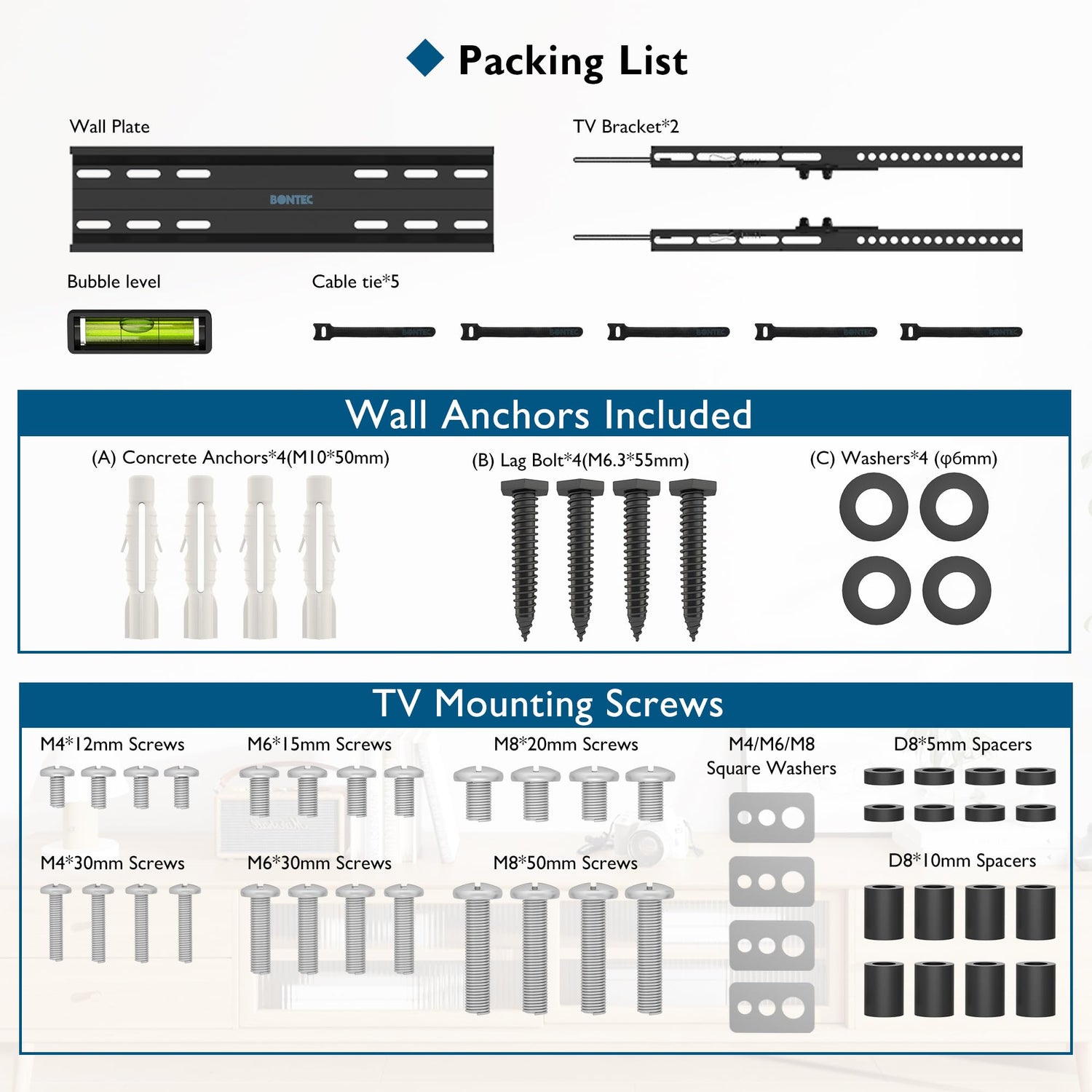 • Einfache Installation: Geeignet für Holzbolzen und Betonwände (Wandanker sind enthalten). Das integrierte Federverriegelungssystem ermöglicht ein einfaches Verriegeln und schnelles Lösen des Fernsehers. Im Lieferumfang enthalten: 5 Kabelbinder, Wasserwaage, leicht verständliche Anleitung und alle notwendigen Befestigungen.