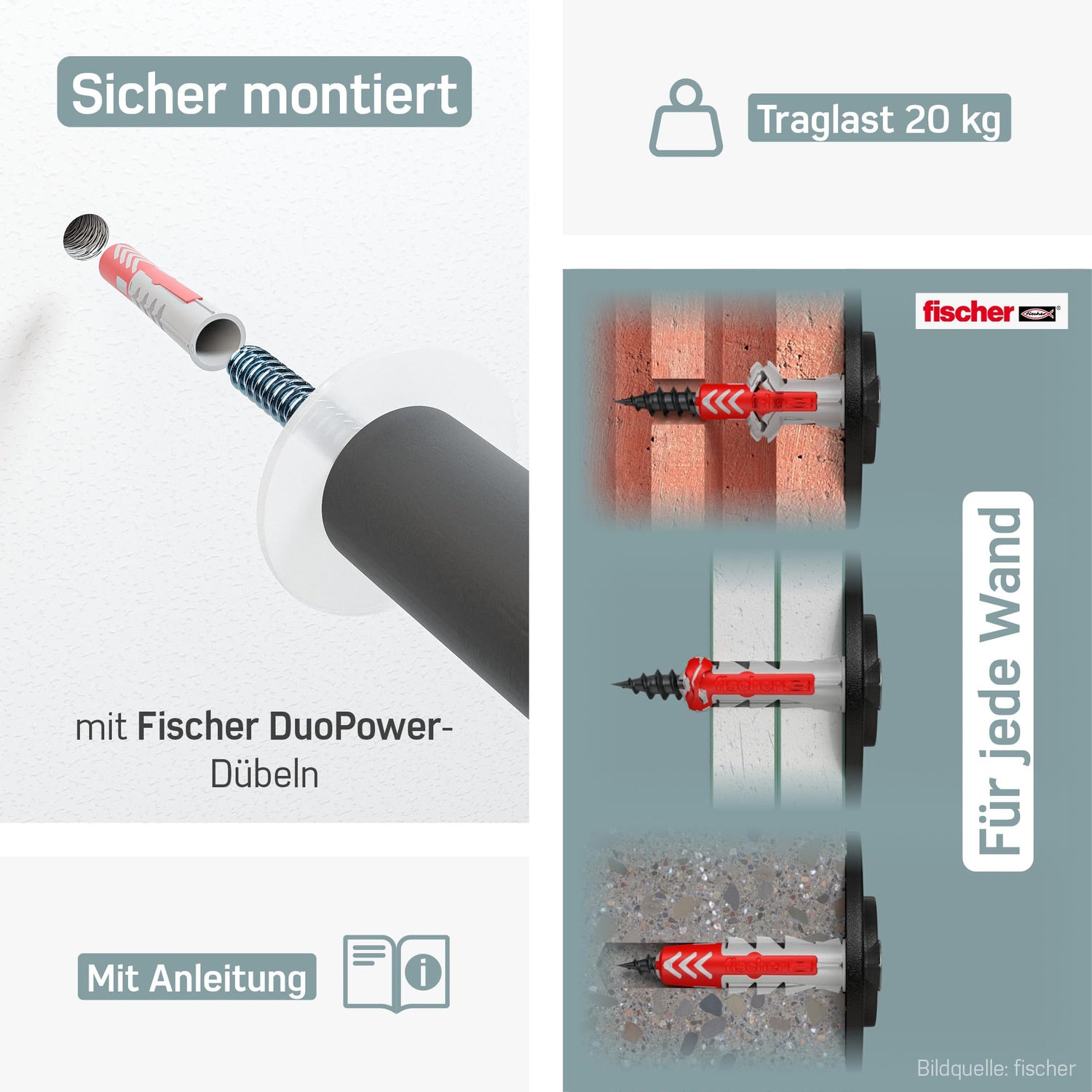 • EXTREM BELASTBAR - Die hochwertige Wandhalterung für Fahrräder, sowie die mitgelieferten Fischer Dübel und M10 Schrauben halten einer Belastung von 20 kg stand. Die Rennrad Wandhalterung hängt Bomben fest!
