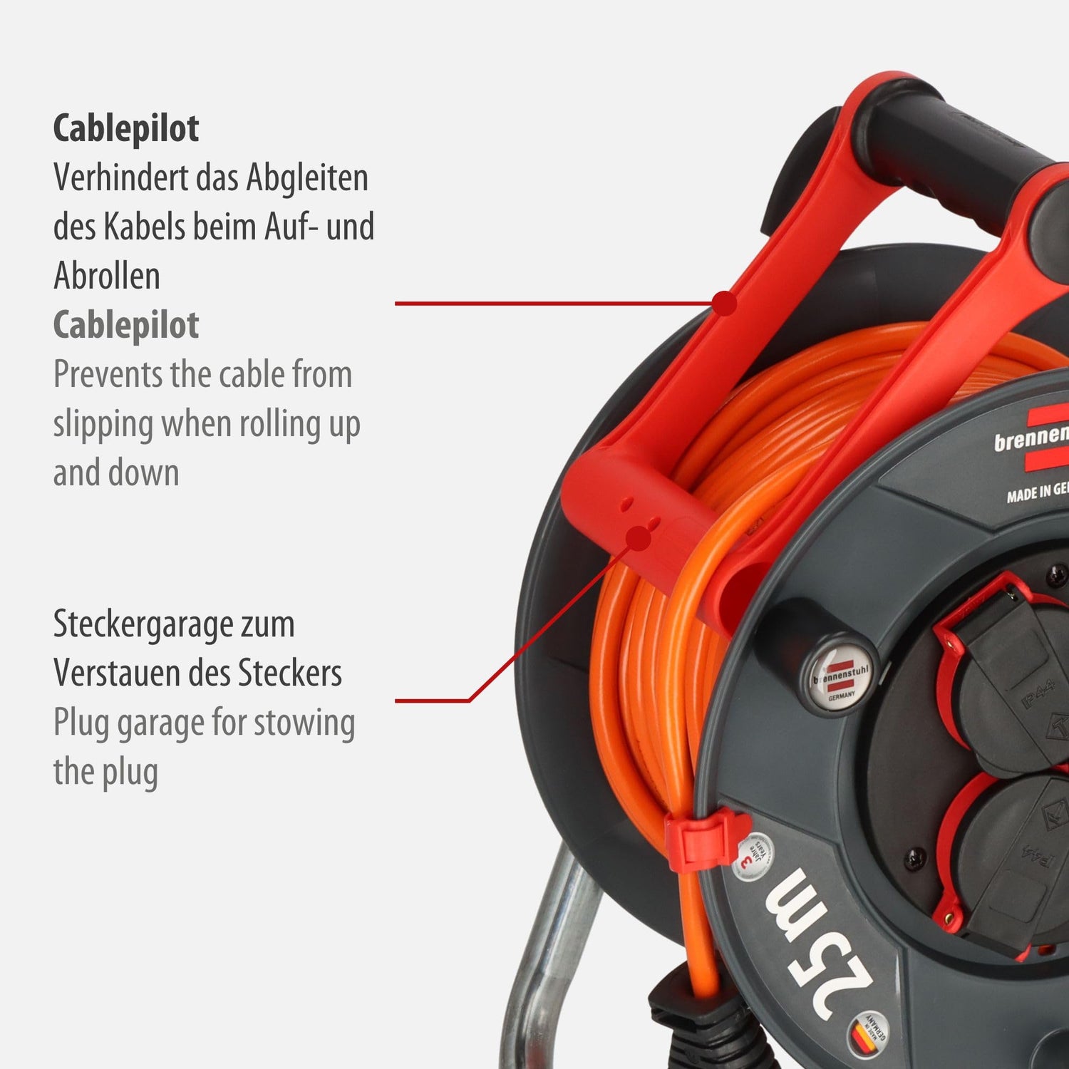 • Die Brennenstuhl Kabeltrommeln überzeugen anhand folgender Features: Made in Germany, Cablepilot mit Steckergarage, Kabelclip, robustes Kabel, Überhitzungsschutz, Trommelbremse, Trommeltritt als perfekte Ergänzung und zahlreiche Qualitätsprüfungen