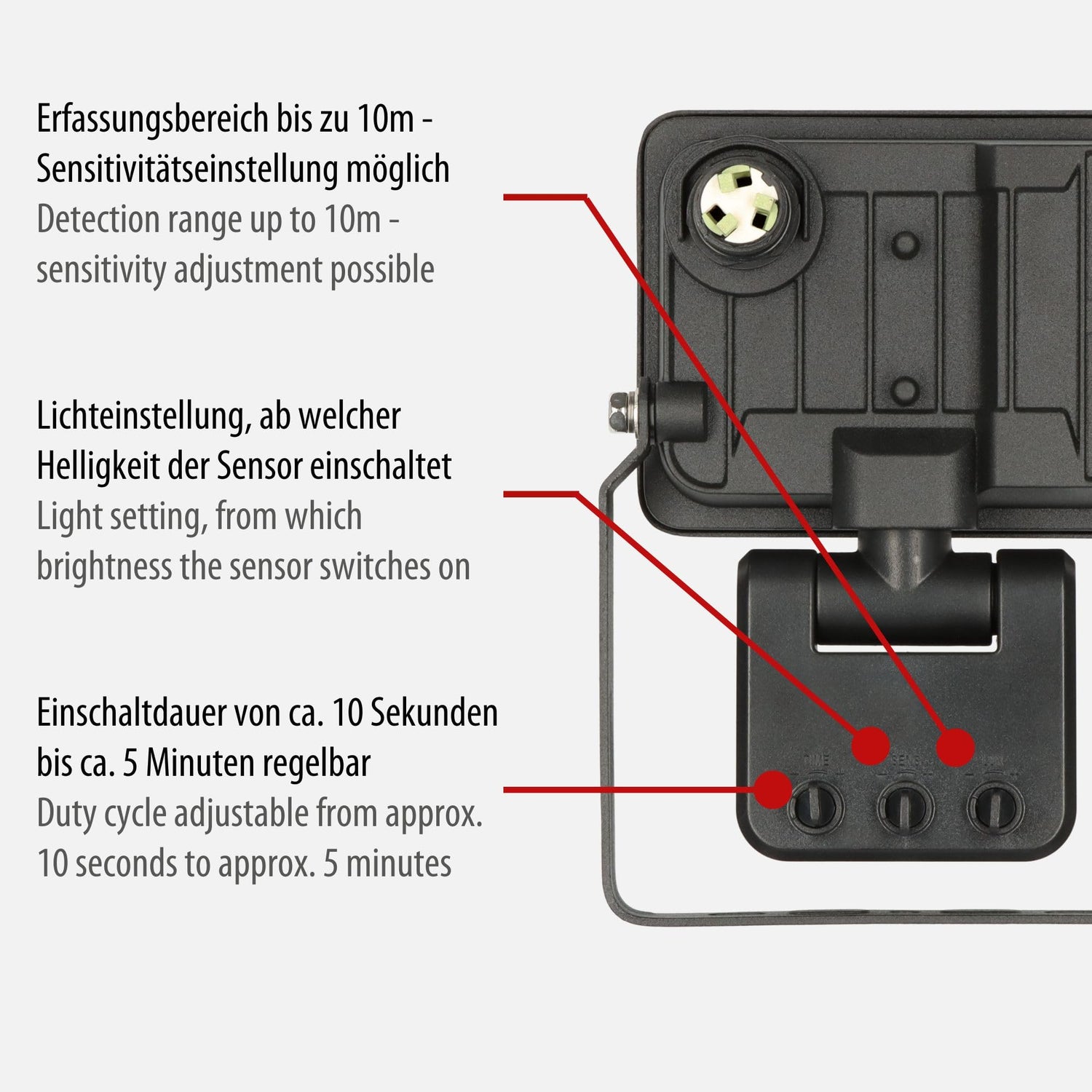 • Superheller LED Fluter mit Bewegungsmelder: Erfassungsbereich bis zu 10m (Sensitivitätseinstellung möglich), Erfassungswinkel ca. 180°, Einschaltdauer zwischen 10 Sekunden bis 5 Minuten regelbar und Dämmerungssensor - individuell einstellbare Beleuchtung
