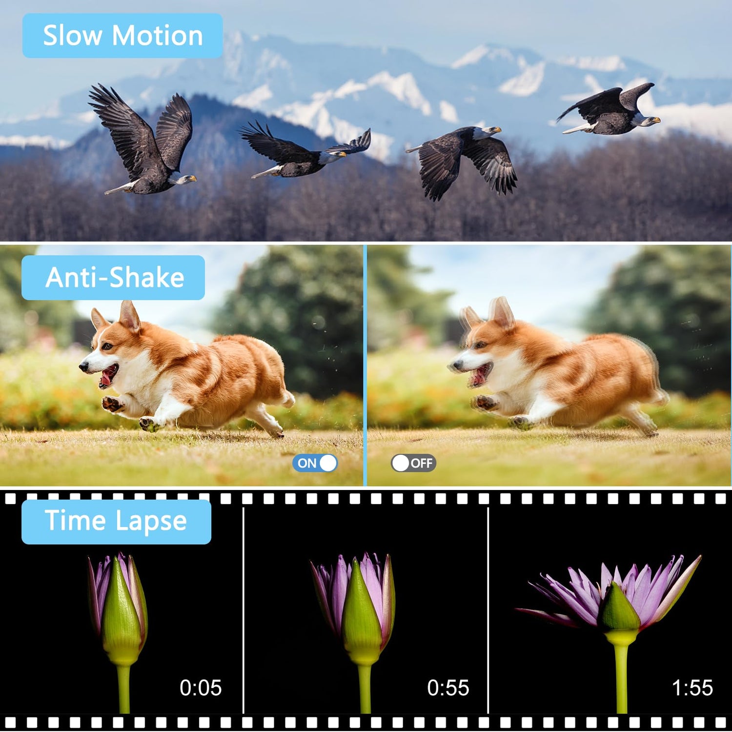 • Zeitraffer-Aufnahmen mit der Videokamera: Die Zeitrafferfunktion ermöglicht es Ihnen, allmähliche Veränderungen zu dokumentieren und die Aufnahmen für eine schnelle Wiedergabe zu komprimieren – perfekt für die Aufnahme von Blumenblüten oder Sonnenauf- und -untergängen. Zusätzliche Funktionen umfassen Zeitlupe, zeitgesteuerte Fotos, Gesichtserkennung, Beauty-Effekte und das Aufnehmen während des Ladevorgangs.