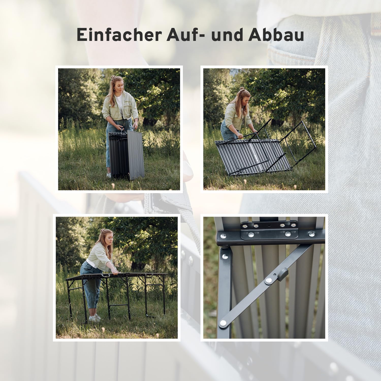 • HOHE FUNKTIONALITÄT: Der Outdoortisch ist mit einer hitzeresistenten Oberfläche ausgestattet, auf der du heiße Töpfe, Pfannen oder andere heiße Gegenstände sicher abstellen kannst. Das ermöglicht es dir, Mahlzeiten direkt am Tisch zuzubereiten und deine Outdoor-Kocherfahrung zu erweitern. Darüber hinaus lässt sich eine Hälfte des Tisches einklappen, um den Platzbedarf zu reduzieren, wenn du nicht den vollen Tisch benötigst.