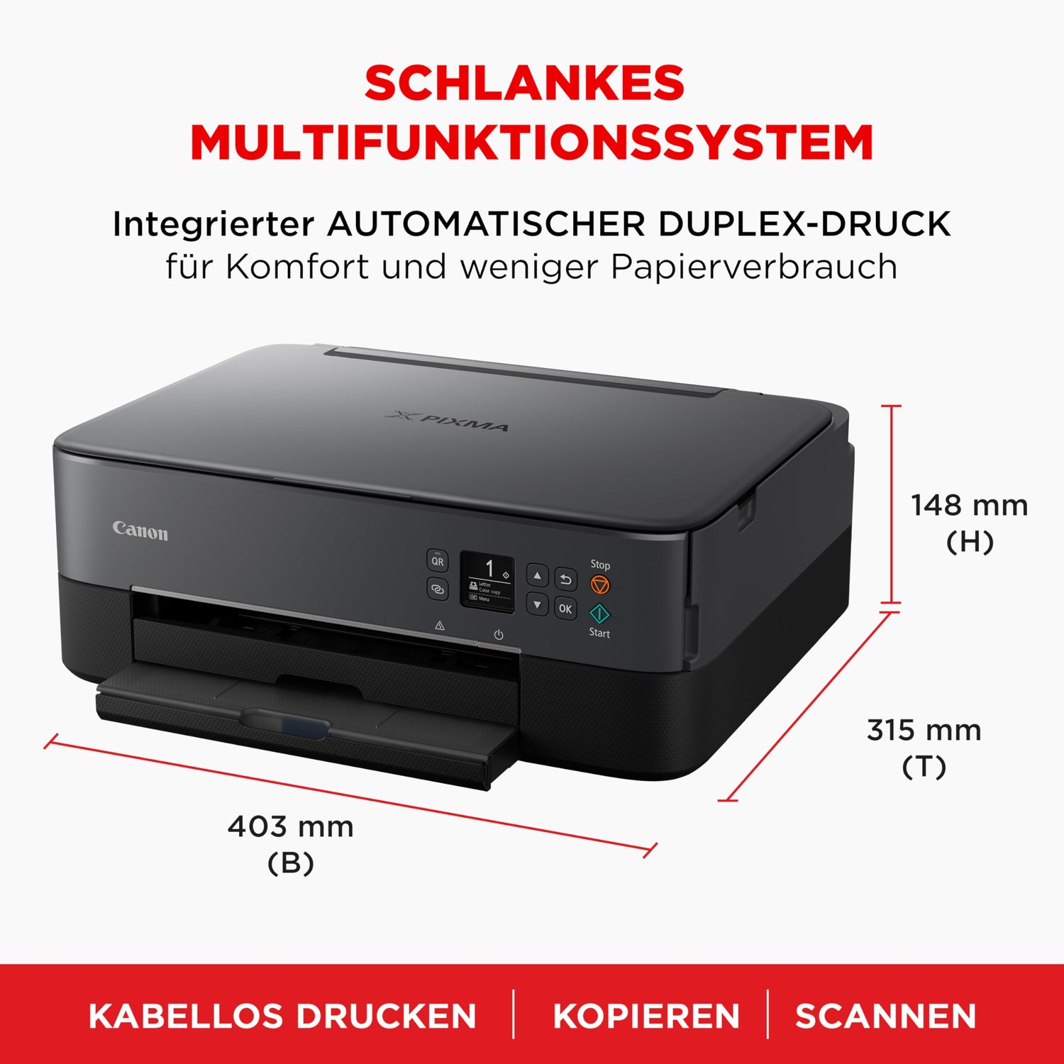 Der Canon PIXMA TS5350i ist der elegante 3-in-1 Drucker, Scanner und Kopierer für Smartphone-Benutzer. Durch sein kompaktes und minimalistisches Design ist dieser Multifunktionsdrucker für das Homeoffice auf gestochen scharfe, hochwertige Drucke für Dokumente und Fotos ausgelegt. Dieser 3-in-1 Farbdrucker der Einsteigerklasse verbindet Konnektivität mit Produktivität und bietet eine kabellose One-Touch-Computerkonnektivität sowie nahtlose Kompatibilität mit deinen iOS- und Android-Geräten. Steuere die Funktionen deines Canon PIXMA Druckers von deinen Mobilgeräten aus, und vereinfache das Drucken, Scannen und Kopieren zu und aus dem Cloud-Speicher (2) mithilfe der Canon PRINT App, Print (iOS) oder Mopria (Android). Erstelle perfekte Fotos mit den FINE Druckköpfen mit Tinte und dem ChromaLife100 Tintensystem, und drucke Medien im Format 13 x 13 cm und 9 x 9 cm sowie randlose Fotos im Format 10 x 15 cm in nur 36 Sekunden (1). Hebe deine kreativen Projekte mit Easy-PhotoPrint Editor, Creative Park und Message In Print auf die nächste Stufe. Beliebig kombinieren – Mit dem PIXMA TS5350i kannst du sogar auf wiederaufklebbarem Papier, beidseitig bedruckbarem mattem Fotopapier und Transferfolie zum Aufbügeln drucken. Profitiere von bis zu 50 % Ersparnis auf Tinte (3) mit dem PIXMA Print Plan und lass dir Tinten direkt bis vor die Haustür liefern, bevor sie zur Neige gehen – für ein stressfreies, kosteneffizientes Tintenmanagement. (1) Die Druckgeschwindigkeit hängt von Systemkonfiguration, Schnittstelle, Software, Vorlagenbeschaffenheit, Druckmodus, Seitendeckung, verwendetem Papiertyp usw. ab. (2) Scan-to-Cloud ist nur bei Verwendung von Canon Originaltinten verfügbar. (3) Die durchschnittlichen Gesamtkosten pro Seite von allen 20 Konkurrenzmodellen wurden genutzt, um die Einsparungen bei Verwendung des Canon PIXMA Print Plan in Prozent zu ermitteln.