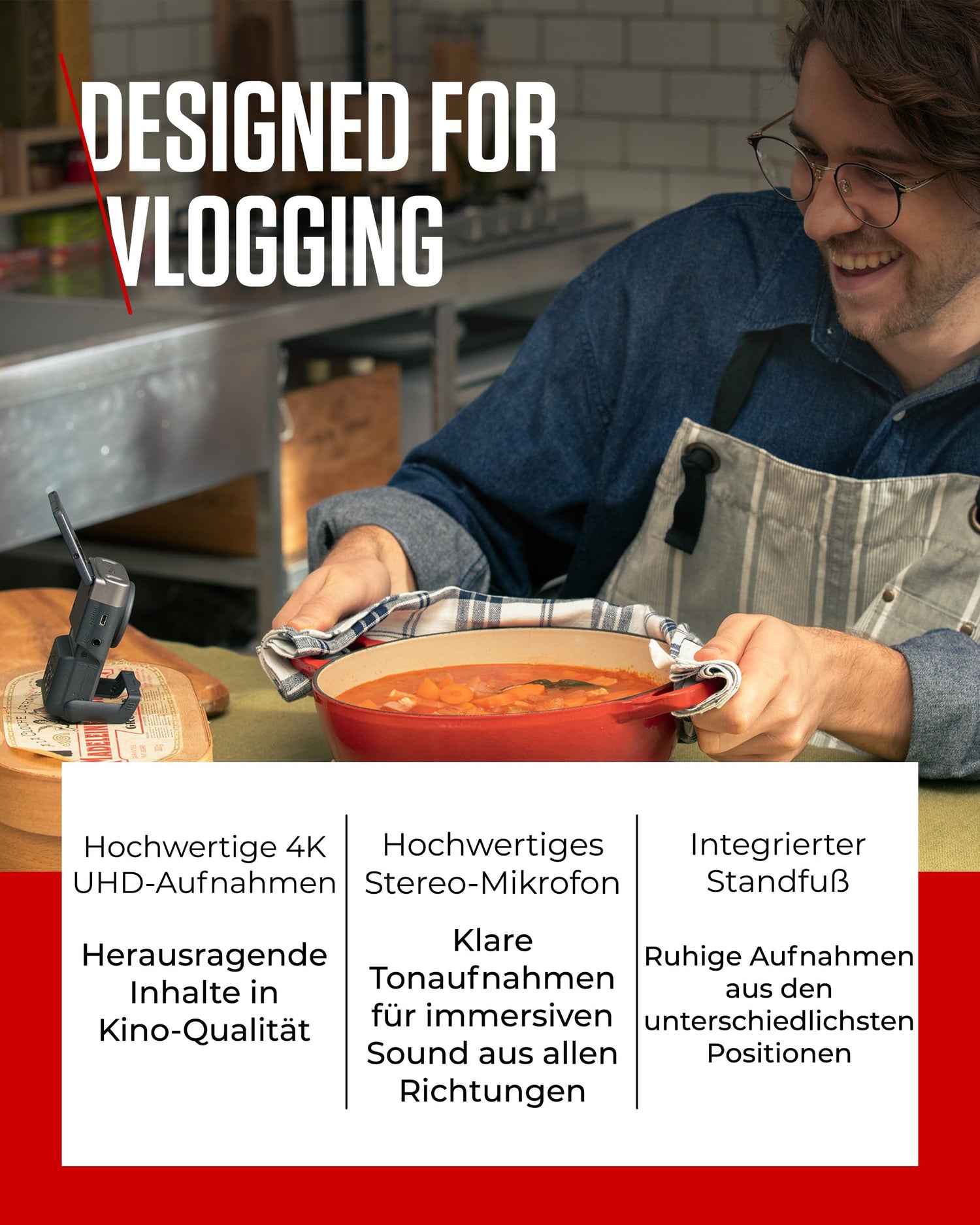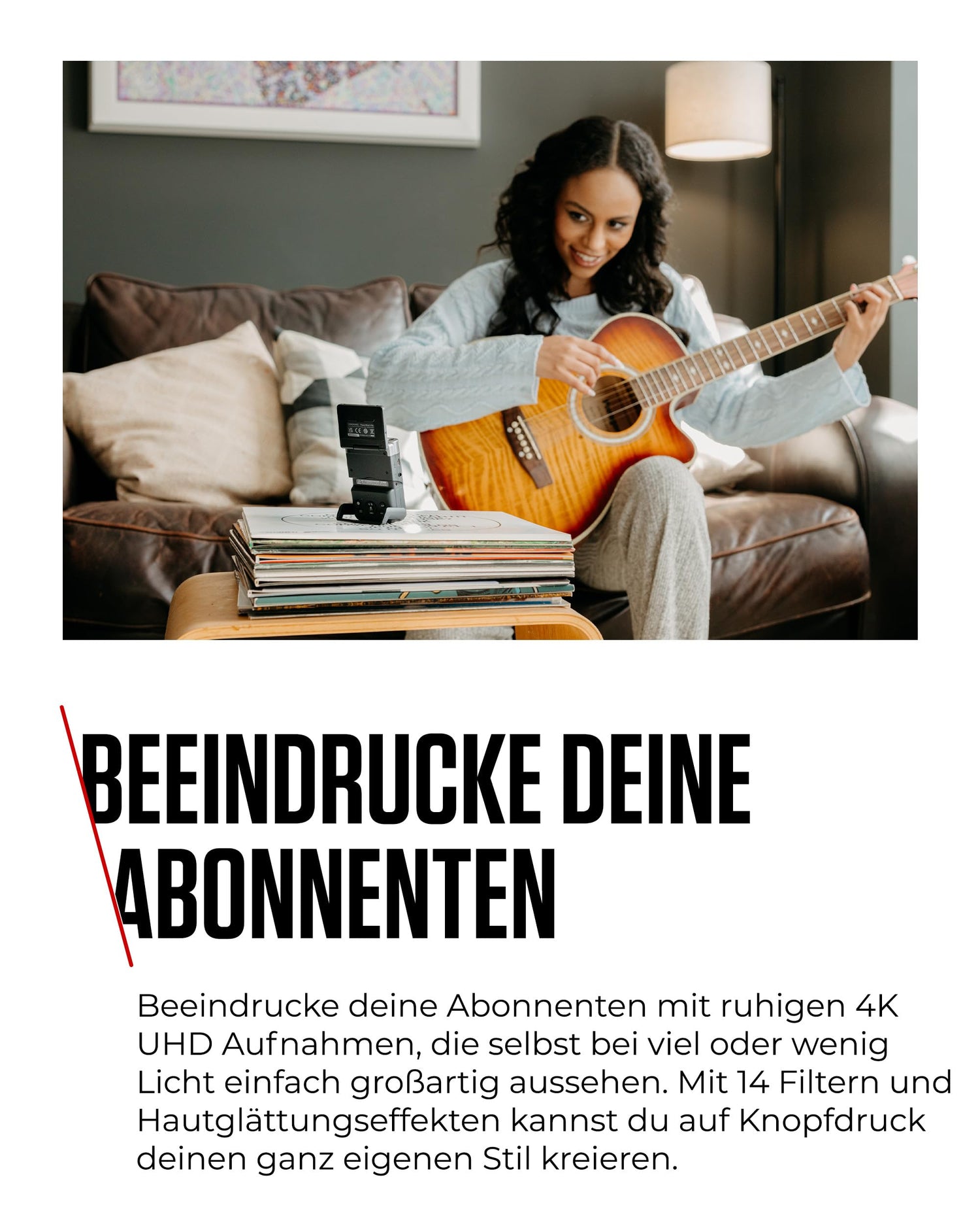 • LEISTUNGSSTARKE BILD- UND TONQUALITÄT - Beeindrucke deine Abonnenten mit verwacklungsfreien Aufnahmen in 4K UHD, mit dem leistungsstarken Mikrofon und einem Windfilter fängst du die Atmosphäre und jedes Wort klar und deutlich ein