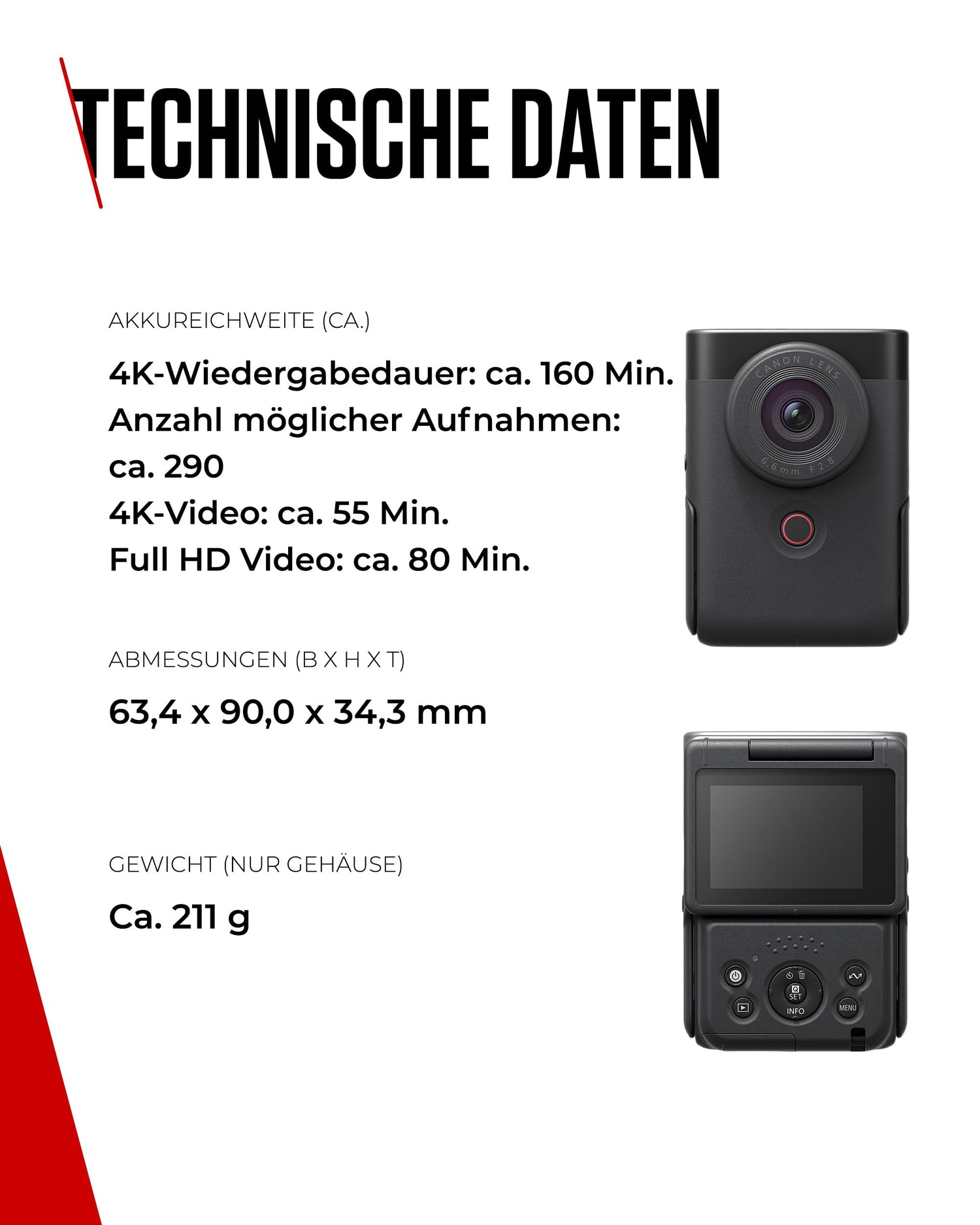 Einzelheiten: Stand out online with the PowerShot V10, Canon’s all-in-one, pocket-perfect vlogging camera, weighing at 211g. Record movie-quality content and engaging vlogs with shake-free 4K UHD up to 30fps and Full HD up to 60fps with Movie Digital IS1, that looks great in bright conditions, thanks to an Auto Neutral Density Filter and in low light. Create your own style with the 14 colour filters, and skin-smoothing effects2, and always stay in focus with Face-tracking. Get more in the frame without stretching your arm thanks to a 19mm (35mm equivalent) F/2.8-8 wide-angle lens. With a 2-inch tiltable screen, a built-in multi-position stand, and powerful built-in stereo microphones that capture every word you say clearly – there’s no need to carry anything else. Thanks to Wi-Fi and Bluetooth connectivity, grow subscribers in real-time, on-the-go using your mobile data3, by livestreaming4 on YouTube and Facebook via the Canon Camera Connect app on your smartphone. Use your camera as a webcam with simple plug-and-play via UVC/UAC5.What’s in the box? PowerShot V10 Black, 64gb High Speed Micro SD, Interface Cable, Wrist Strap, Textile Case, Lens Cap, Mini Windshield, User Manual Kit1. Movie digital IS crops movies. Cannot be combined with auto level, digital zoom or Smooth skin mode, 2. Stronger Smooth Skin effect reduces resolution of eyelashes, hair and areas adjacent to the skin. 3. May involve third-party fees, or charges. Stream quality depends on upload speed, mobile data service, availability, coverage. 4. A stable 2.4ghz Wi-Fi connection with fast upload speed is recommended. 5. USB Type-A power not guaranteed. PD compliant USB port required for powering the camera whilst using as a webcam.