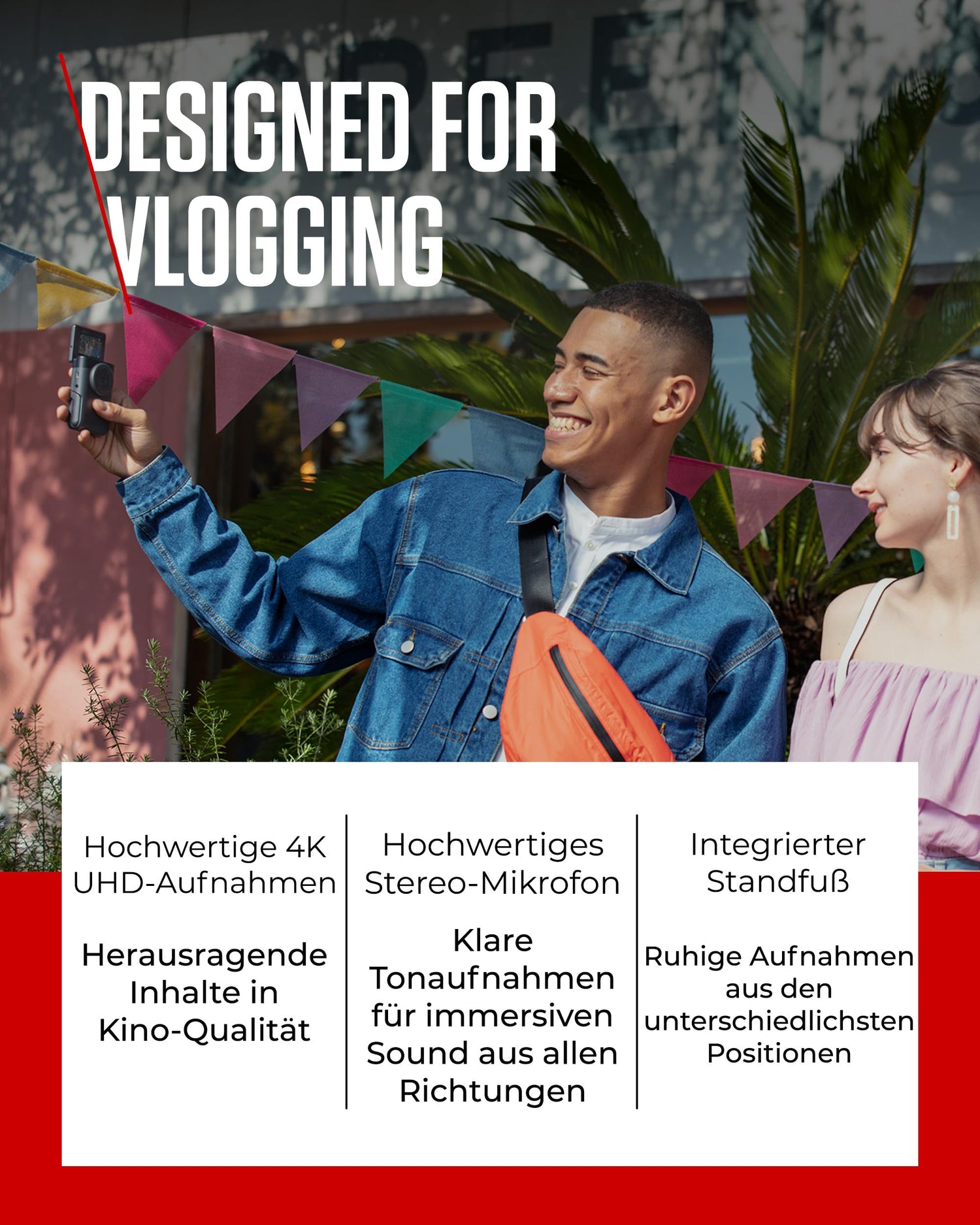 - LEISTUNGSSTARKE BILD- UND TONQUALITÄT - Beeindrucke deine Abonnenten mit verwacklungsfreien Aufnahmen in 4K UHD. Mit dem leistungsstarken Mikrofon und einem Windfilter fängst du die Atmosphäre und jedes Wort klar und deutlich ein.