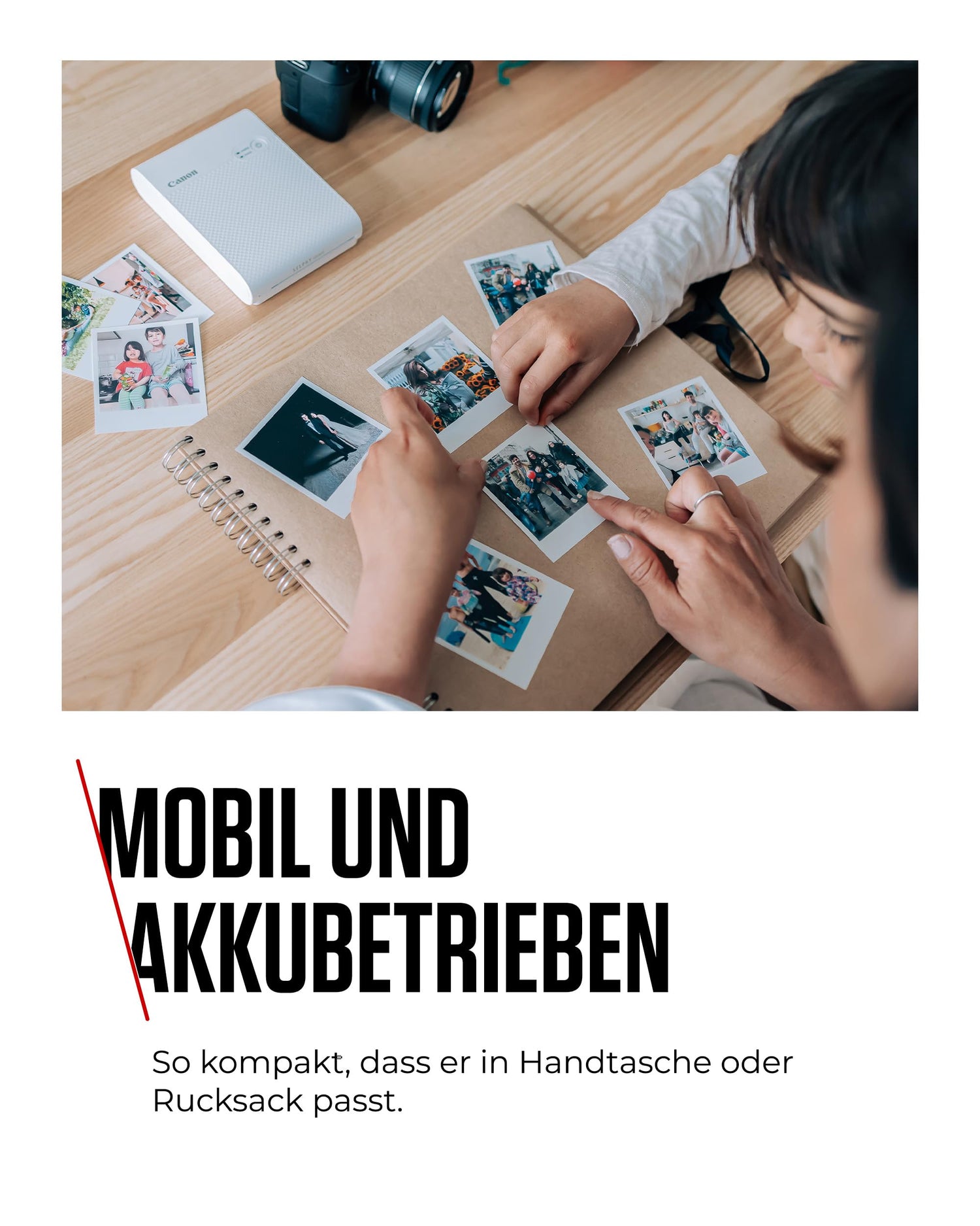 • KOMPAKT UND LEICHT (14,3 x 10,2 x 3,1 cm, 480g) - Kleiner als eine Postkarte und mit weniger als 500 g passt der portable Fotodrucker in fast jede (Hand-)Tasche oder Rucksack. Zusammen mit dem separat erhältlichen Fotopapier Canon XS-20L erstellt er quadratische Prints im Sofortbild-Look mit Kleberückseite
