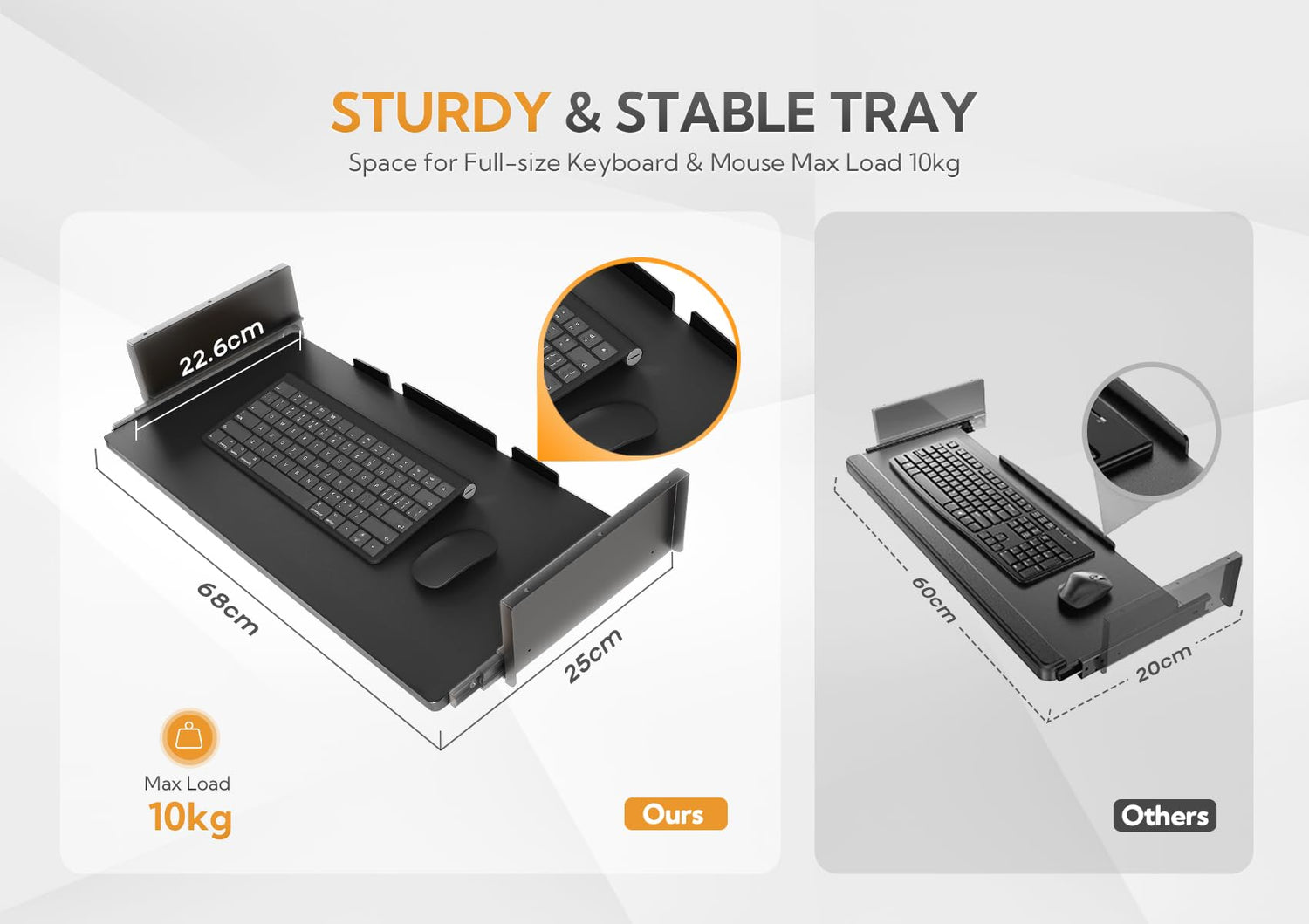 • Großzügig Tastaturablage: Der verstellbare Schreibtisch ist mit einer ausziehbaren Tastaturablage ausgestattet, die 68 x 24.8 cm groß ist und eine Tastatur in voller Größe Platz bietet.