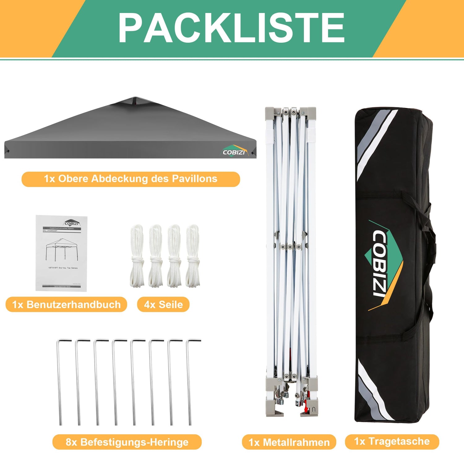 • √𝙈𝙚𝙧𝙠𝙢𝙖𝙡𝙚-1x COBIZI Faltpavillon 3x3, 1x Tragetasche, 8x Erdnägel, 4x Spannseile, Montageanleitung.Auf das Zelt gibt es eine einjährige Garantie und auf den Stoff und das Zubehör eine sechsmonatige Garantie. Bei Fragen können Sie sich jederzeit an uns wenden. Wir werden innerhalb von 24 hrs antworten.