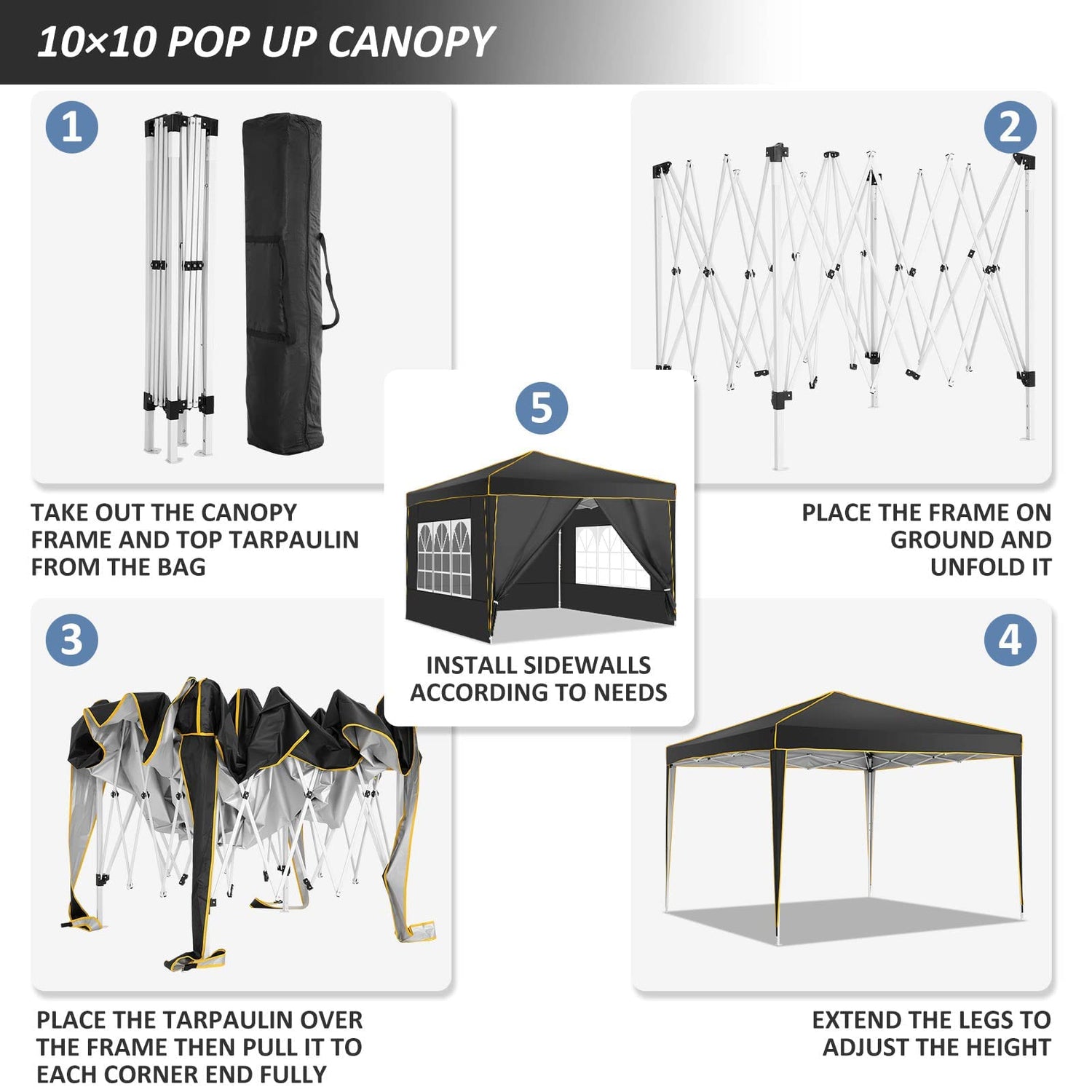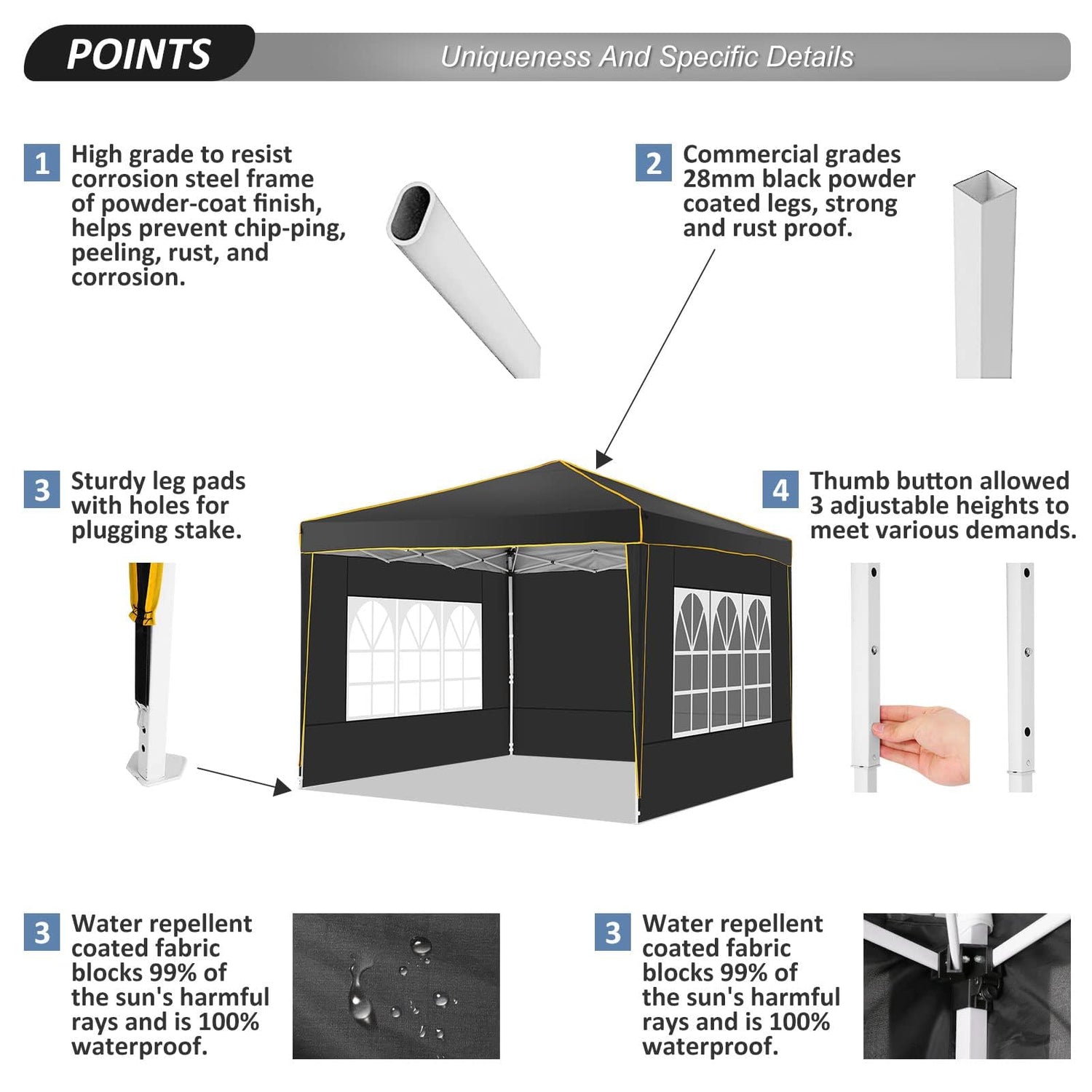 • 【Upgraded 3-Height Settings】Drei verschiedene Höheneinstellungen ermöglichen es Ihnen, die Höhe zu wählen, die Ihren Bedürfnissen entspricht. Mit hoher, mittlerer oder niedriger Höheneinstellung: 97.2"-100.8"-104.4". Gerades Beindesign bietet 100 Quadratfuß Schattenfläche. Perfekt für Outdoor-Event Schutz oder kommerzielle Aktivitäten in Bauernmarkt, Hinterhof, Camping, Hochzeit, Festivals, Strand, Sportveranstaltungen, Familienfeiern, BBQ.