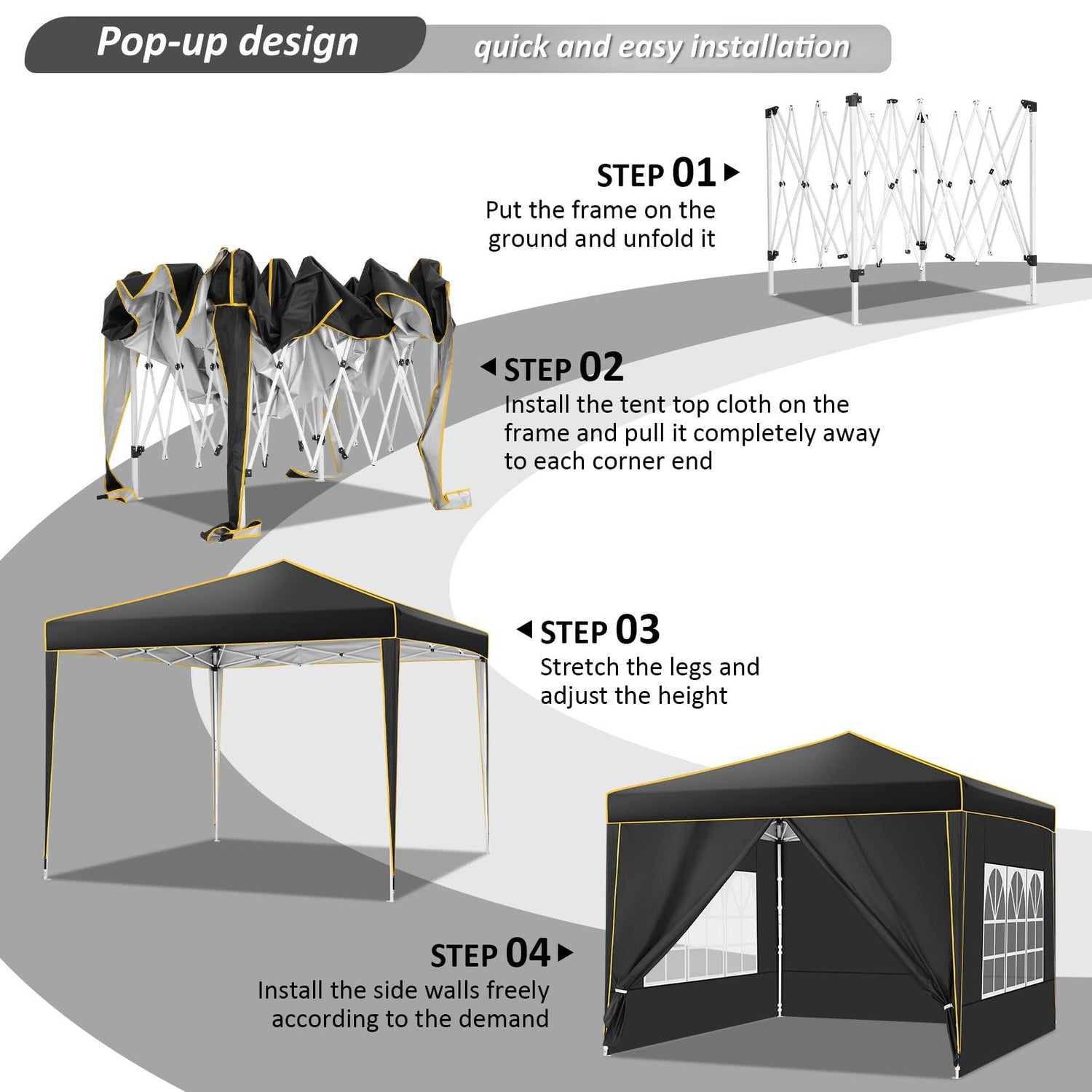 • 【4 Seitenwände + Sandsäcke】: Sofortige Überdachung hat 4 Seitenwände--2 Wandpaneele mit Kirchenfenstern für Licht in; 1 Türpaneele mit Reißverschluss für einfachen Zugang. Die Seitenwände sind abnehmbar, Sie können die Positionen frei wechseln und wählen, ob sie für verschiedene Zwecke eingestellt werden sollen oder nicht. 4 Sandsäcke und Pfähle und 4 Seile erhöhen die Stabilität an windigen und stürmischen Tagen. Noch stabiler!