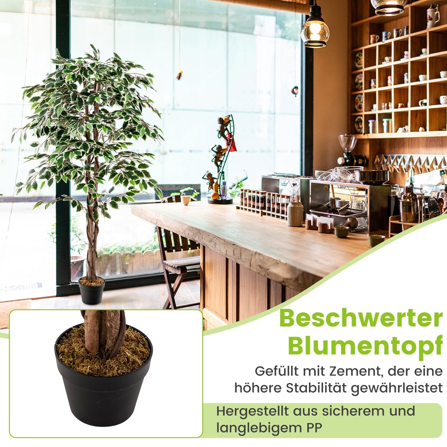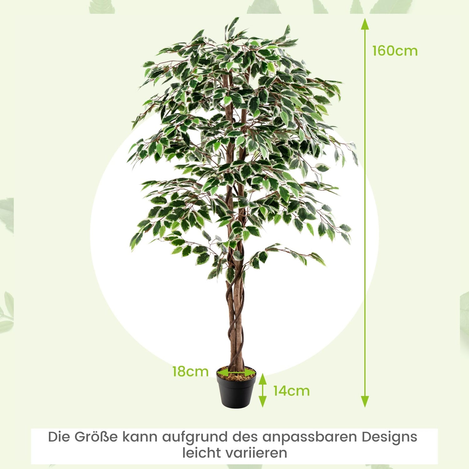 COSTWAY 160 cm Kunstpflanze grün, Künstliche Pflanze Ficus Benjamin, Dekopflanze mit natürlichem Holzstamm & Blättern, Zimmerpflanze Deko, Kunstbaum Innendekoration, für Zuhause Garten Büro