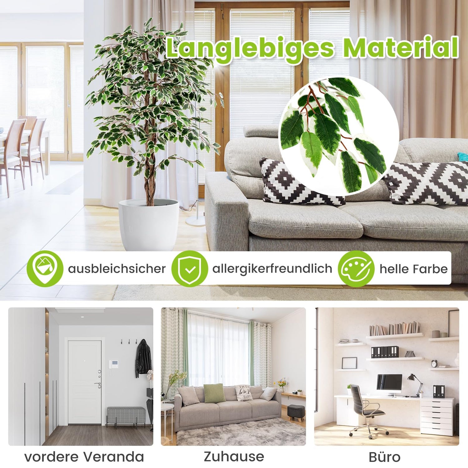 • 【Wirklich lebensechtes Erscheinungsbild】 Der künstliche Ficus-Baum verfügt über 1008 üppige Blätter mit weißen Rändern, die ein bemerkenswert realistisches Aussehen schaffen. Um den natürlichen Reiz weiter zu verstärken, werden ein echter Holzstamm mit verdrehten Ranken und getrocknetes Imitatmoos eine Note Vitalität zur Gesamtdarstellung hinzufügen.