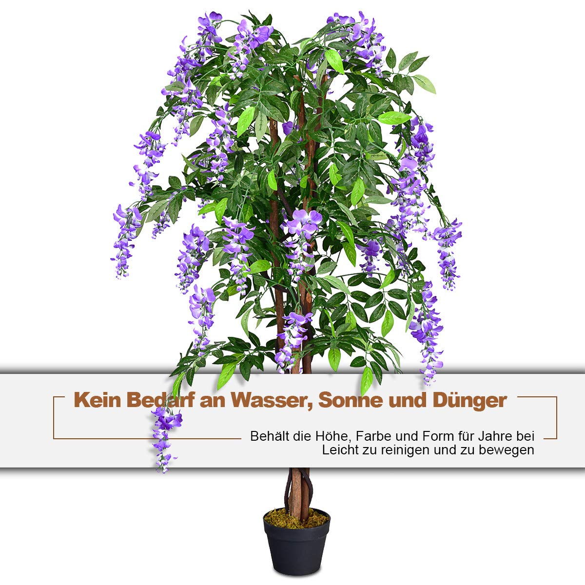 COSTWAY Kunstbaum mit Blüten, Kunstpflanze im Topf, Zimmerpflanze mit natürlichen Blättern & 3 Stämmen, Künstlicher Baum Kunstblume Lila, Dekopflanze künstlich, Zimmerpflanze Grünpflanze 150 cm