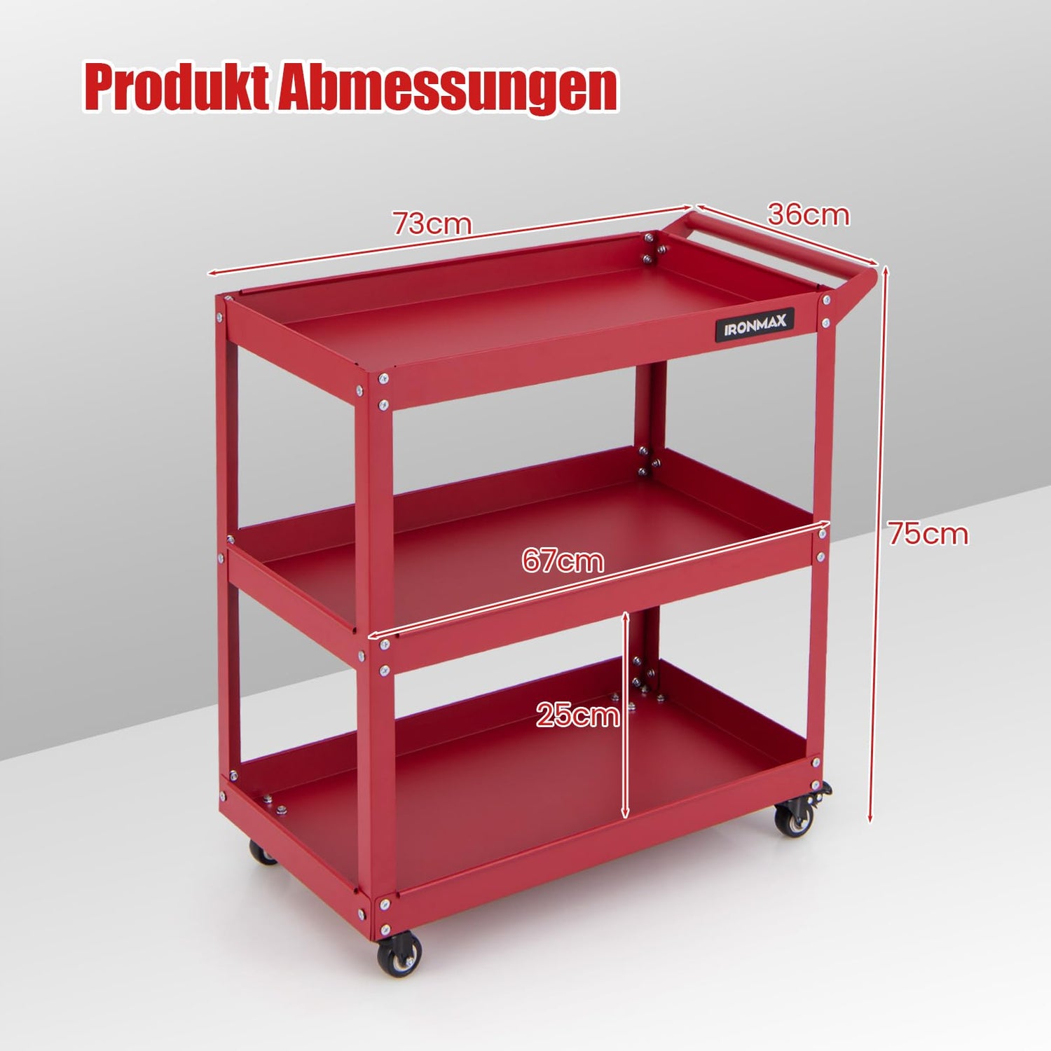 • 🧰【Viel Stauraum auf 3 Ebenen】Mit 3 großen Ablageflächen von 36 x 66 cm bietet Ihnen dieser funktionale Werkzeugwagen ausreichend Platz für die Aufbewahrung mehrerer Werkzeuge. Durch die gute Organisation aller Gegenstände verbessert der Rollwagen auch Ihre Arbeitseffizienz.