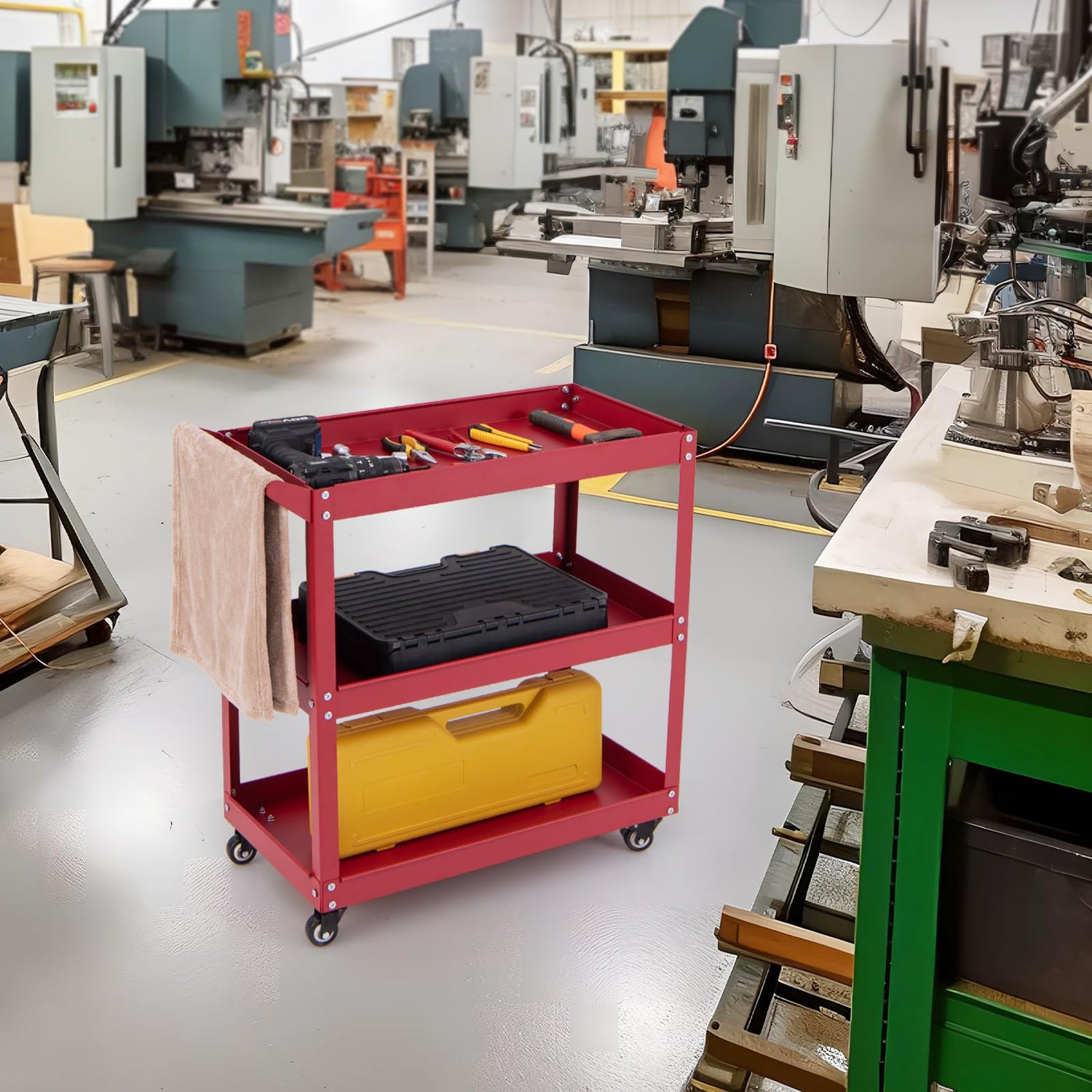 Ermöglichen Sie effiziente Organisation und mühelose Mobilität mit diesem dreistufigen Werkzeugwagen, der für jeden Arbeitsplatz unverzichtbar ist! Mit seinen 3 großen Ablageflächen bietet dieser Wagen ausreichend Platz zum ordentlichen Aufbewahren und Ordnen verschiedener Werkzeuge und Vorräte. Der robuste Metallrahmen gewährleistet eine hohe Belastbarkeit von bis zu 120 kg. Die Manövrierfähigkeit ist mit 4 Universalrädern, darunter zwei feststellbaren, ein Kinderspiel und sorgt für eine stabile und sichere Bewegung auf verschiedenen Oberflächen. Dieser Wagen ist mit durchdachten Details wie einem praktischen Griff zum Aufhängen von Handtüchern und erhöhten Kanten ausgestattet, um das Herunterfallen von Gegenständen zu verhindern. Er eignet sich ideal für den Einsatz in Werkstätten, Küchen, Büros usw. Steigern Sie Ihre Produktivität und sorgen Sie mit diesem vielseitigen Servicewagen für Ordnung in Ihrem Raum.