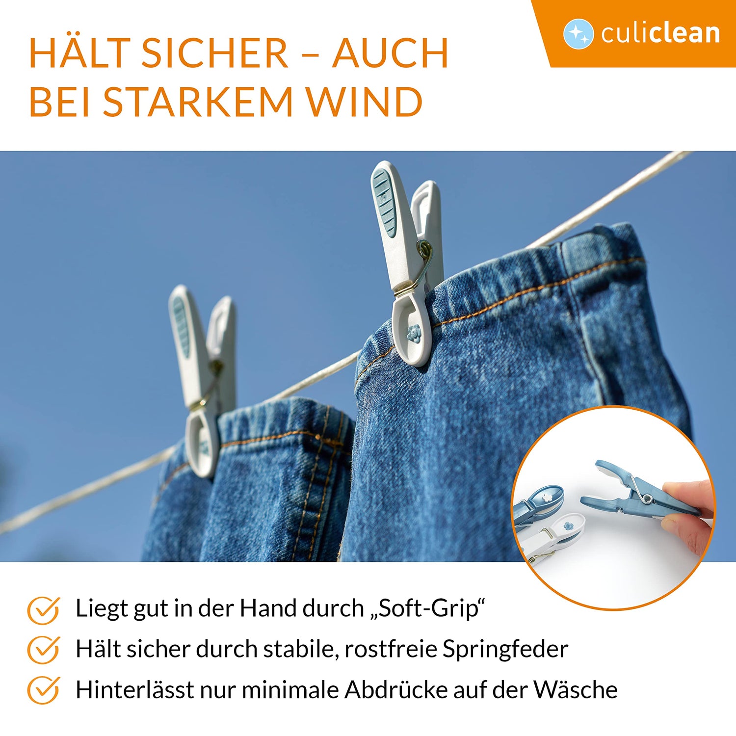 • ✅ SICHER – robuster Kunststoff mit STARKER SPRINGFEDER hält Ihre Wäsche auch bei stürmischem Wetter dort, wo sie trocknen soll. GEPOLSTERT hinterlassen die Klammern (fast) keine Abdrücke auf Ihrer Wäsche. EINFACHE HANDHABUNG durch SOFT GRIP.